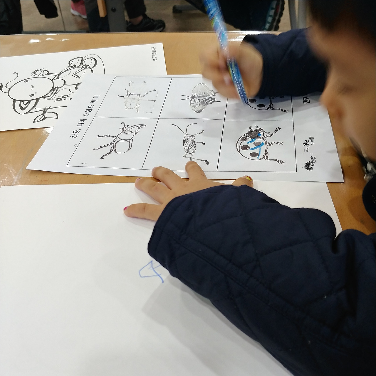 색칠 놀이할 수 있는 공간과 함께 옆에는 전통놀이가 한창이었다. 최근 수달에 관련된 그림책을 읽어서 인지 몰라도 주변을 두리번거리다 수달 그림 도안을 보고 "수달이다"라고 반가워했다. 색연필을 들고 거침없이 색을 채워가는 아들. 몇 가지 곤충 도안에 색칠하면서 퀴즈를 좋아하는 아들과 곤충 이름 맞추기도 했다.