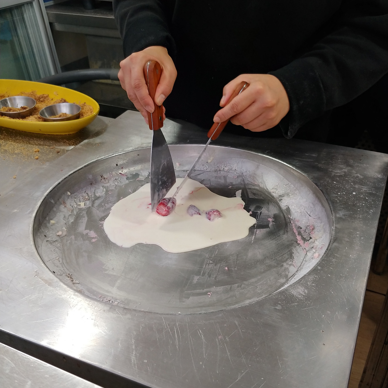 한옥마을에 파는 호떡은 남달랐다. 정확하게 기억은 안 나지만 분명한 것은 밀가루 반죽이 아니었다. 몸에 좋은 뭐로?? 발효시킨 반죽. 기름에 튀기다시피 만든 호떡이 아닌 기름기가 없어서 아이와 부담 없이 먹을 수 있었다. 아들은 먹성은 남다르다. 딸기 맛 철판 아이스크림에 관심을 보였고 결국 사 먹었다.