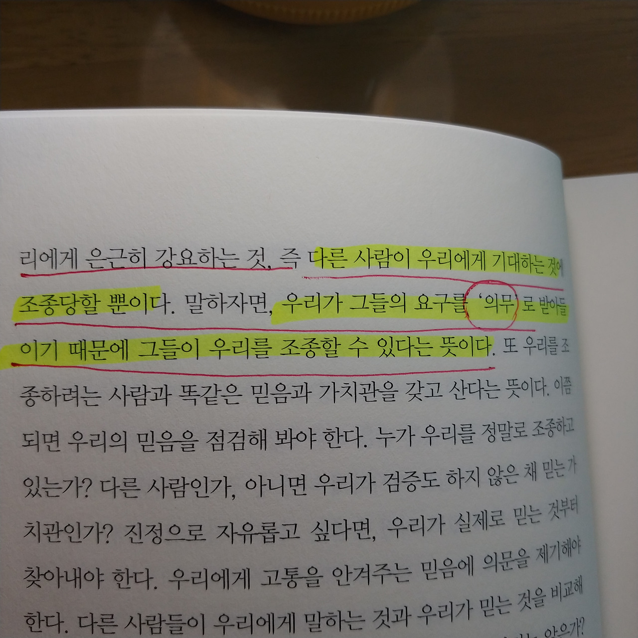 나의 경험이다. 나는 장남이다. 대한민국에서 장남이 가지는 특권도 각별하지만 그것 못지않게 따르는 책임감도 무시 못한다. 그러한 책임을 누가 요구하거나 강요하지 않는다. 다만 문화 속, 사회 속에서 관계 맺고 영향을 받는 나로서는 무의식으로 장남은 성공해야 된다, 경제적으로 보탬이 되어야 한다, 부모님을 부양해야 한다는 책임이 앞선다. 저자가 말하는 근거 없는 믿음이다. 물론 그 책임을 다하고 사느냐는 다른 문제이지만 영향을 주는 것은 명백한 사실이다.(저자는 이러한 생각도 자신이 선택한 일이라고 한다.)