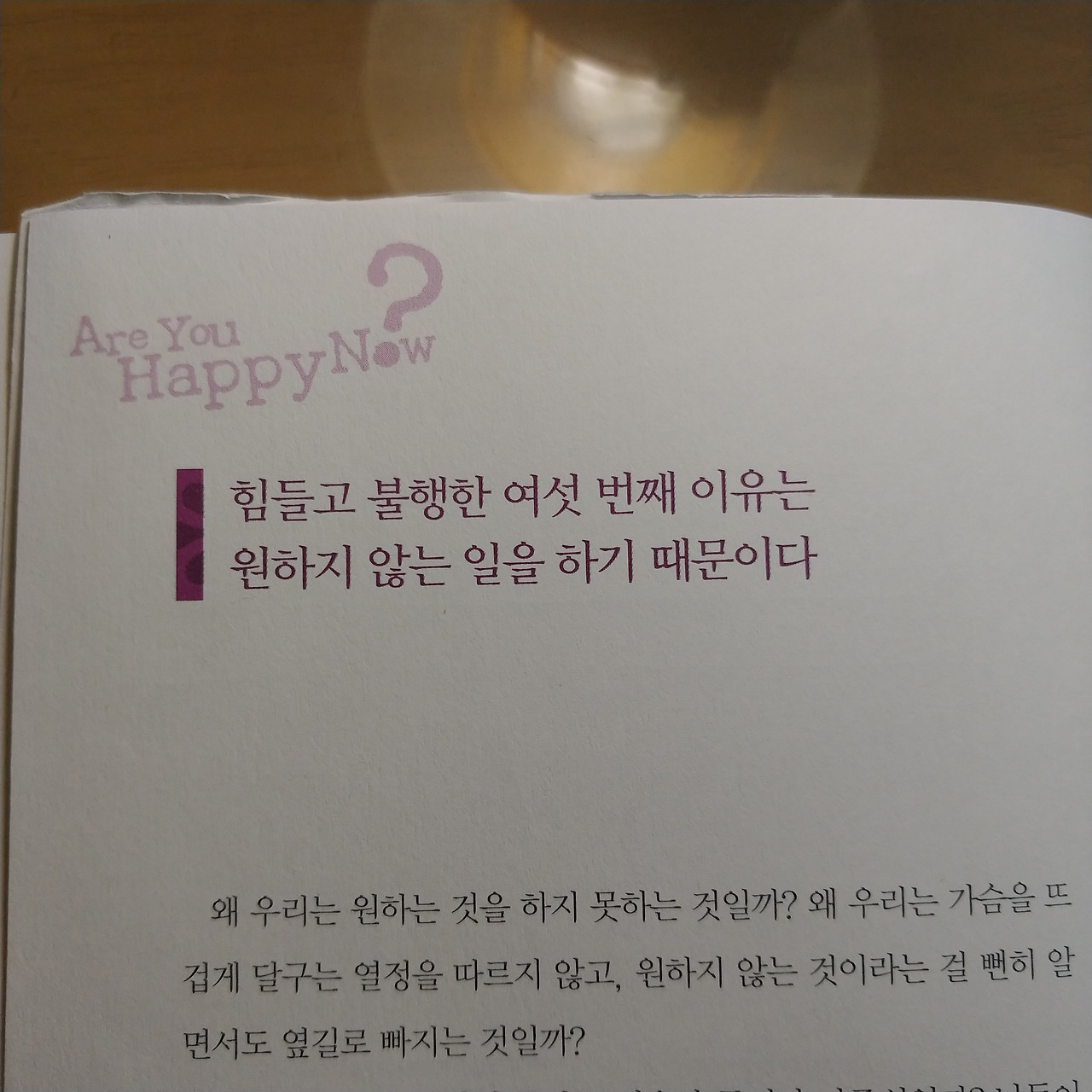가슴 뛰는 일을 하라. 열정을 따르라. 저자는 우리가 행복하지 않은 여섯 번째 이유를 원하지 않는 일을 하기 때문이라고 한다.