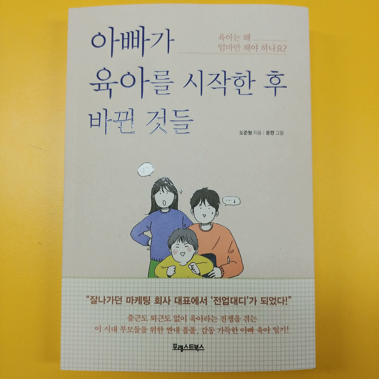 이 책은 한자리에서 한 호흡에 읽히는 책이었다. 나도 모르게 맞아! 맞아! 연신 무릎을 치며 격한 공감을 했다. 내용은 크게 아빠 육아(아내의 복직), 독박 육아(주말 부부), 육아하면서 터득한 깨달음 세 부분으로 나뉜다. 그중 자신을 찾아 새로운 도전을 하는 부분이 가장 인상 깊었다. 유튜브 도전 이야기는 육아에 지친 부모에게 용기 주는 대목은 아닐까. 부모가 행복해야 아이들도 행복할 수 있다는 말처럼 들렸다.