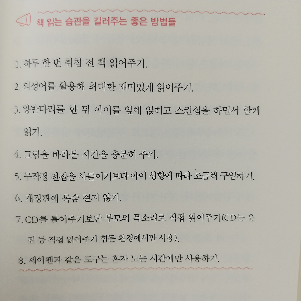 책 곳곳에 아이를 키우면서 알면 좋은 정보, 노하우가 많았다. 특히 아빠가 깨달은 육아 철학에서 저자의 노하우를 확인할 수 있었다. 학습능력이 뛰어난 아이로 키우는 방법, 영어 공부시키는 방법, 책 읽는 아이로 키우는 방법, 자존감 높은 아이로 키우는 방법 등은 육아에 좋은 노하우였다. 산후우울증 자가진단표는 신의 한 수이지 않을까.