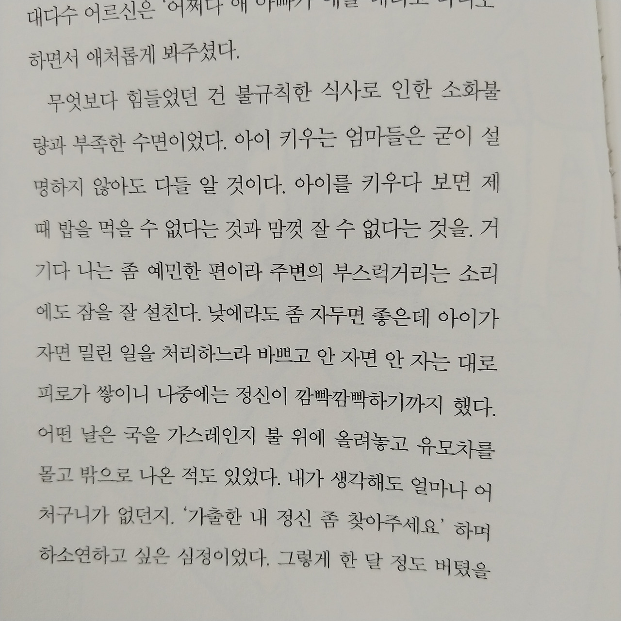 가끔은 아무것도 안 하고 늘어지게 늦잠 자고 싶다. 2시간 만에 일어나는 신생아 때엔 새벽에 수시로 깼다. 육아 스트레스는 피로 누적과 함께 걷잡을 수 없이 커졌다. 그렇다고 늘어지게 늦잠 잘 수 없다. 회복 없는 육아의 악순환이 계속해서 이어진다. 2교대, 3교대보다 더 힘든 직업이 부모라는 저자의 말에 공감했다. 첫째와 둘째는 유독 일찍 일어난다. 주말에도 어김없다. 6시 30분이면 첫째든 둘째든 경쟁하듯 일어난다. 누가 됐든 더 늦게 일어나는 날에는 단연코 아픈 날이다. 문득 알람 소리 없이 아이들보다 먼저 일어나는 일이 서글퍼질 때가 있다.