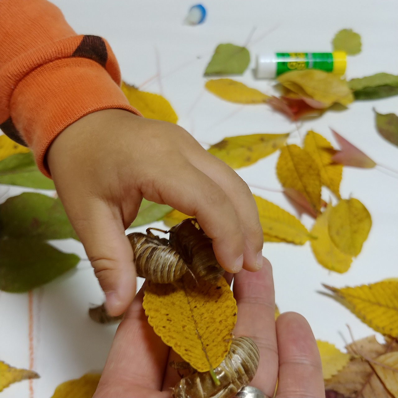 주어 온 낙엽, 이름 모를 열매와 잎에 붙어있던 매미 번데기로 미술 놀이를 했다.