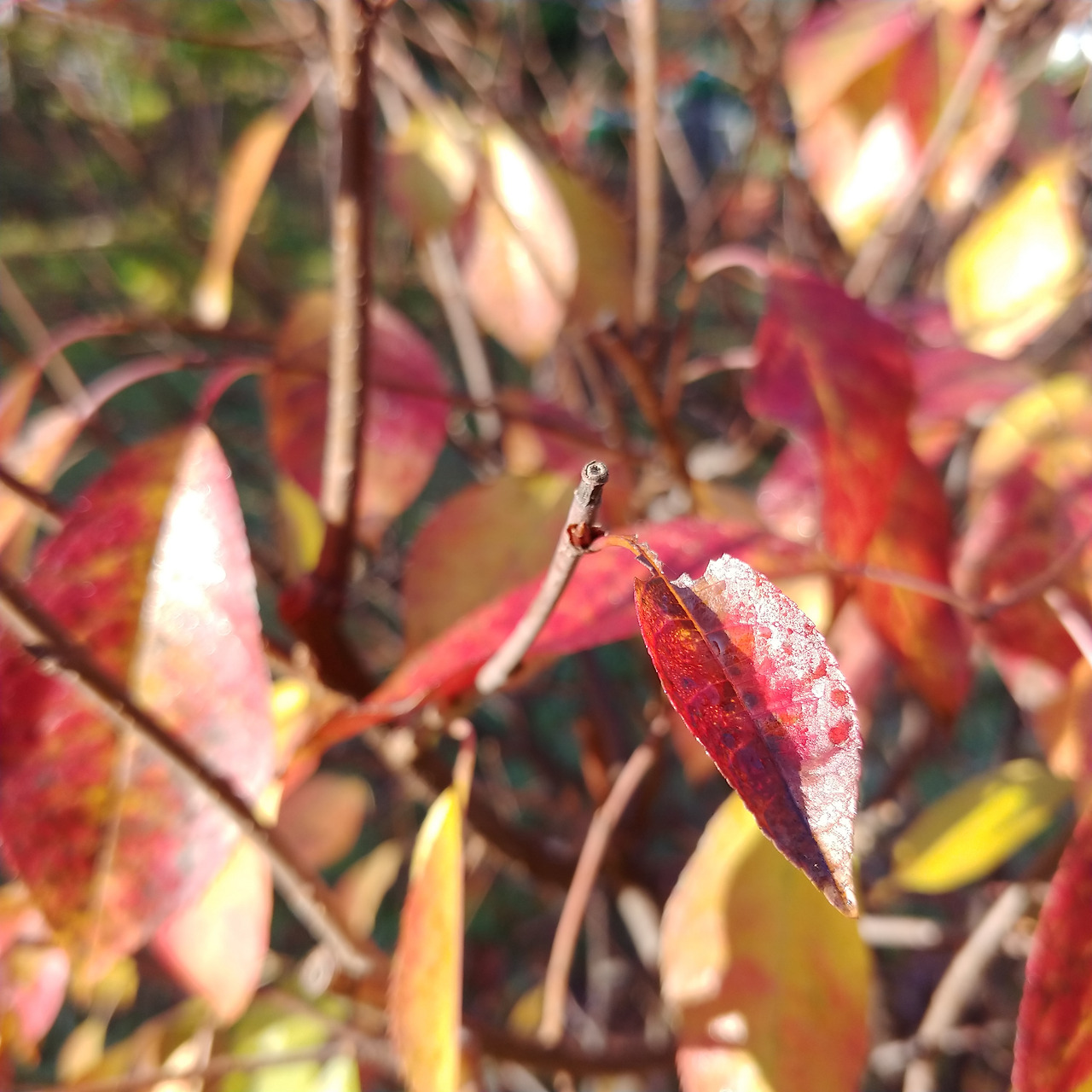 서리가 아직 잎에 몽글몽글 맺혀있었고 아침 햇살이 노란 잎을 투명하게 비친다. 신비로움을 더하는 아침 풍경이었다.