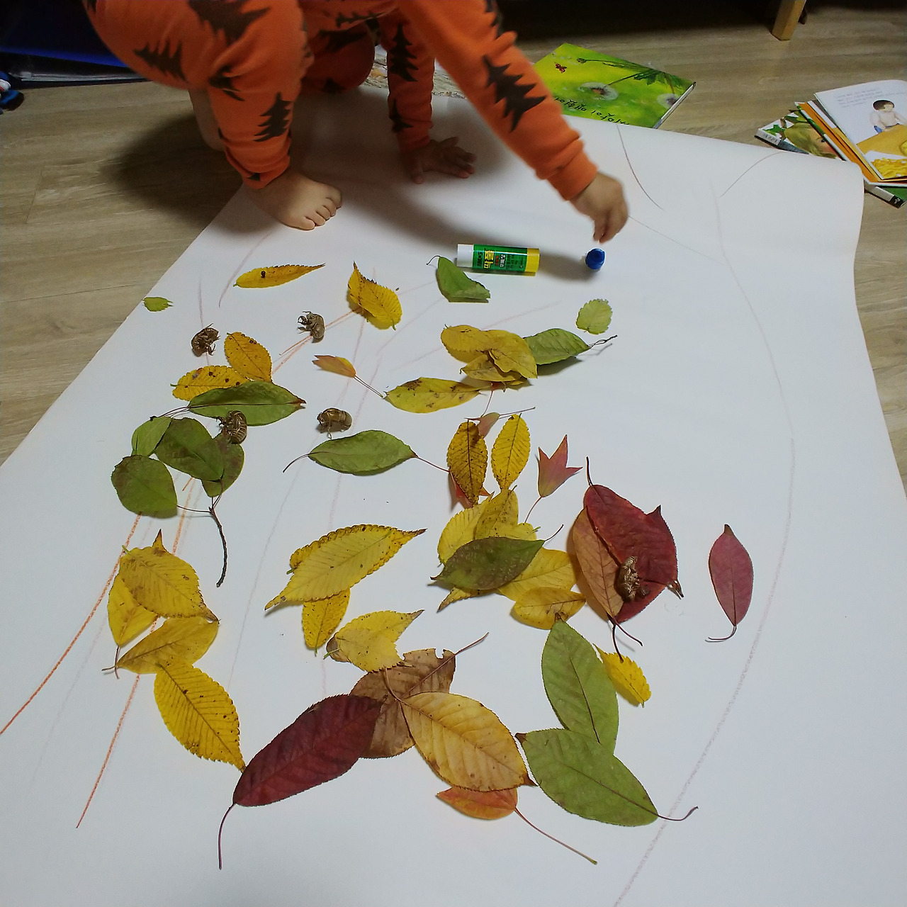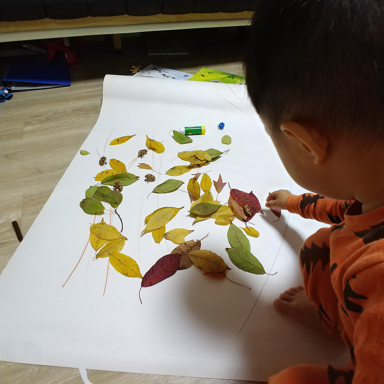 원래 나의 생각은 내가 나무를 그리면 아들이 색을 칠하길 바랐다. 너무 큰 기대였나. 3살 아들이 하기에는 어려운 과제였나 보다. 나 혼자만 열심히 그리고 색칠했다. 다 그린 뒤 낙엽을 이리저리 옮기며 잎이 떨어지는 모습을 보여줬다. 휴! 오늘 생각했던 놀이는 다 했다. 아들아 가을을 느꼈니? 계절의 변화를 느끼는 어른으로 커주면 좋겠구나.
