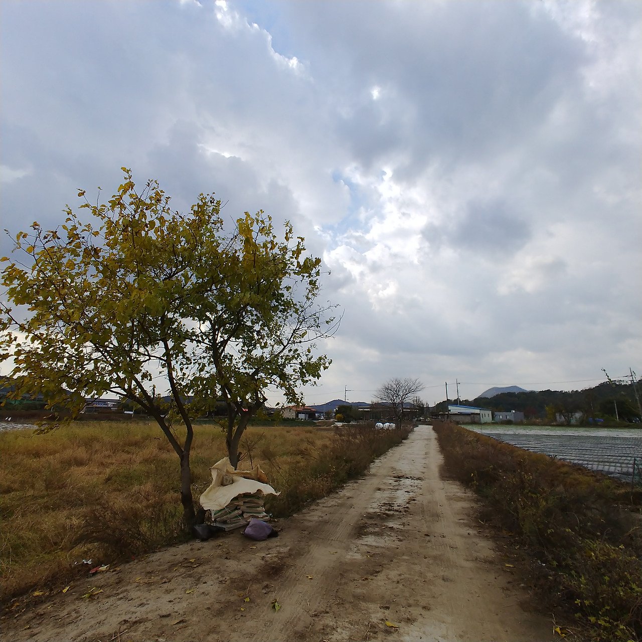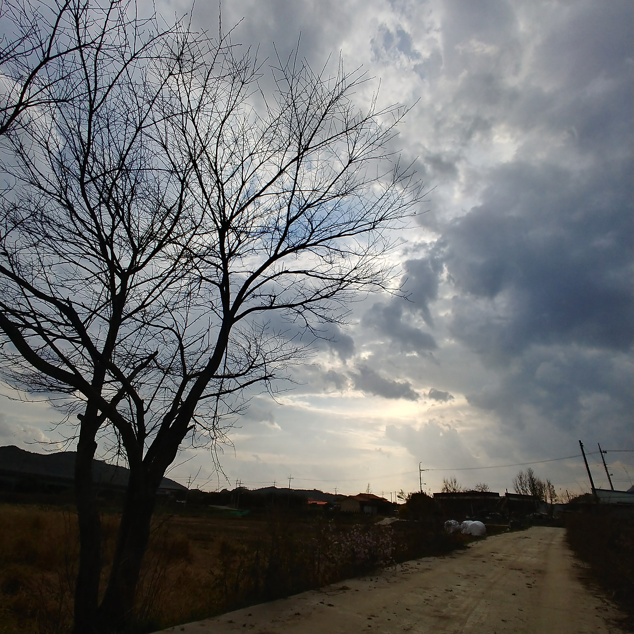 시골길에 혼자 서있는 나무 한그루. 쓸쓸하게 길을 지키고 있다.