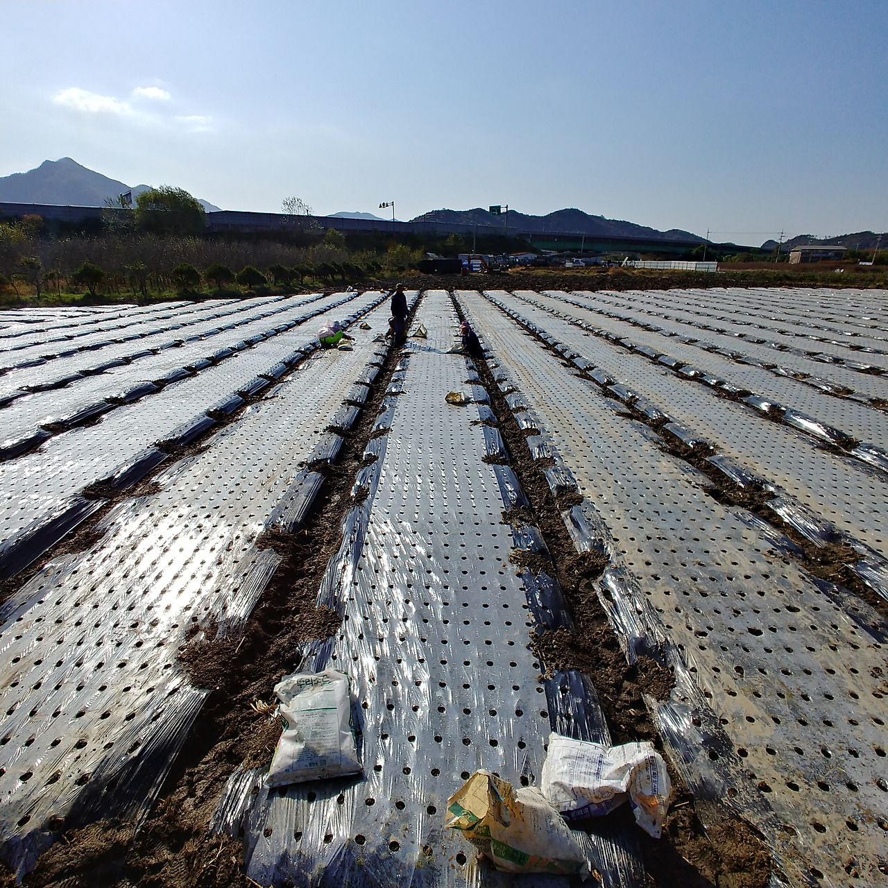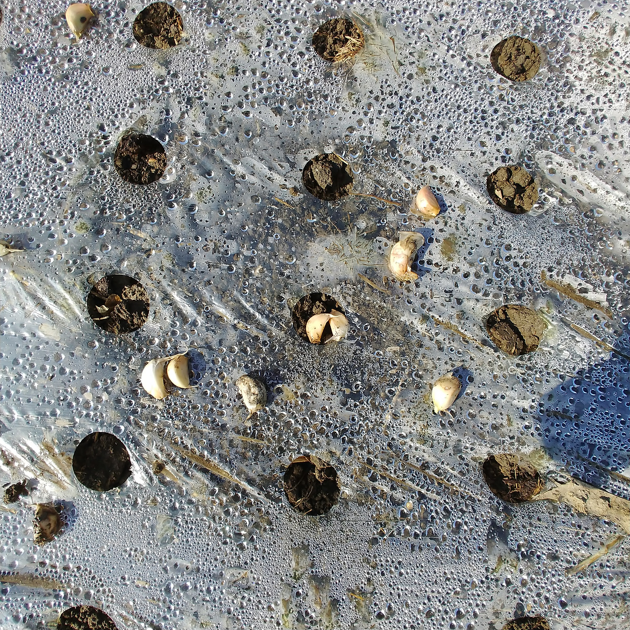 오늘 작업하는 양이 어마어마하다. 구멍 난 비닐에 마늘 하나를 쏙 넣으면 다시 자라요.
