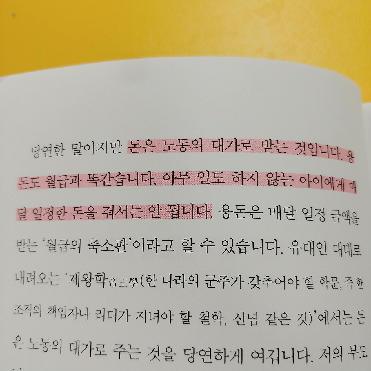책 P18.사실 홈 아르바이트는 신선한 충격이었다. 아이에게 너무 가혹한 게 아닌가 싶었다. 하지만 저자의 말대로 그냥 주는 용돈은 돈의 소중함과 노동의 가치를 알 수가 없다. 돌이켜보니 부모님에게 받은 용돈은 화수분처럼 여기고 아낌없이 썼던 것 같다. 알바로 힘들게 번 아르바이트비는 애지중지하면서 말이다.