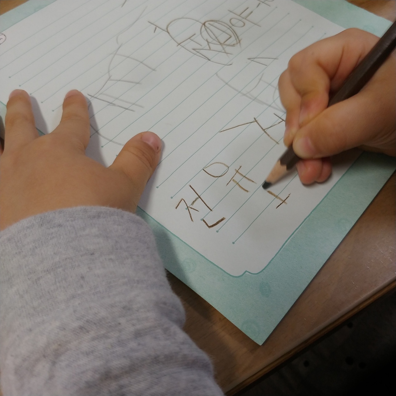 지금은 손도 가세했다. 제법 자신의 이름 쓰는 아들. 생각해보면 색연필을 제대로 잡을 수 있을 때부터 빠르게 익힌 것 같다. 처음에는 색연필을 주먹 쥐듯 잡았다. 마치 붓글씨 쓰는 것처럼. 어색하고 잔뜩 힘이 들어간 손놀림으로 쓴 글씨는 한참 들여다봐도 도통 알 수가 없었다. 글자가 아니었다. 아무렇게 휘날린 선에 불과했다. 하지만 끄적끄적 낙서하거나 그림 그리는 시간이 늘수록 손놀림도 정교해졌다. 어느 순간 색연필도 어른처럼 잡았다. 안정감이 더해진 글쓰기는 낙서와 다름없었던 선에서 누가 봐도 읽을 수 있는 글자가 되었다.