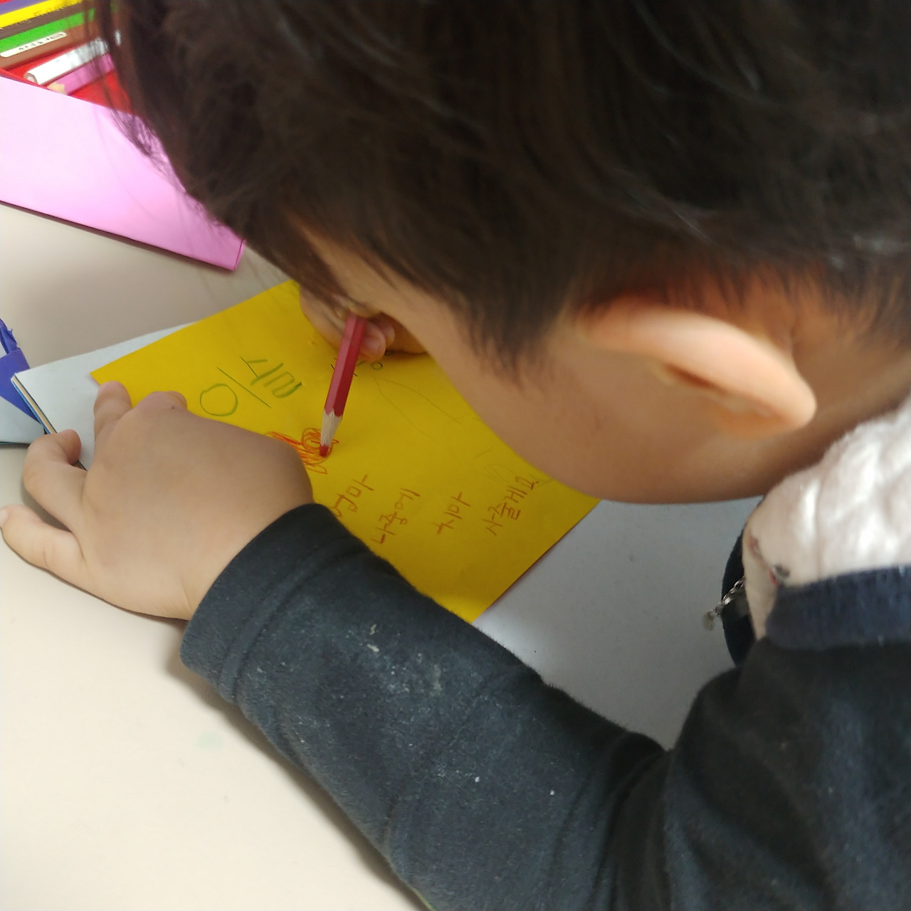 아들에게 "화이트데이는 남자가 여자한테 사탕을 주면서 사랑한다고 고백하는 날이야!"라고 알려줬다. "유호야! 엄마 오기 전에 이벤트 준비하자."라고 꼬드겼다. 아들과 함께 색종이에 편지를 썼다. 아들 손에 색연필을 쥐여줬다.