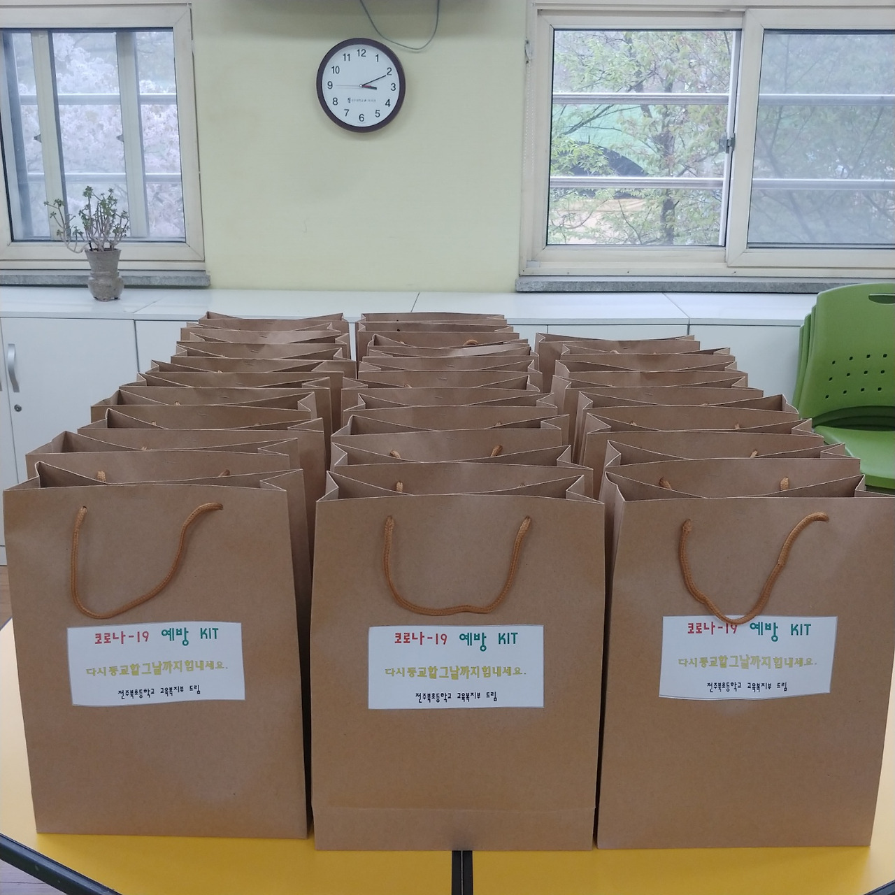 1차로 교육복지 배려 학생 가정에 코로나-19 예방 KIT를 전달했다. 마스크, 손 소독제, 구강 청결제, 치약, 칫솔, 항균 비누, 항균 핸드 워시, 항균 물티슈 등 아이들 위생 물품을 챙겼다. 교육복지실에서 배부를 했으며 학교에 방문하기 어려운 가정은 직접 가정방문을 하기도 했다. 1차 물품 수령이 끝나는 대로 2차 긴급 지원을 위한 회의를 소집했다. 도시락 배달과 생필품, 특히 식품 지원 가정을 구분해 지원하기로 결정했다.