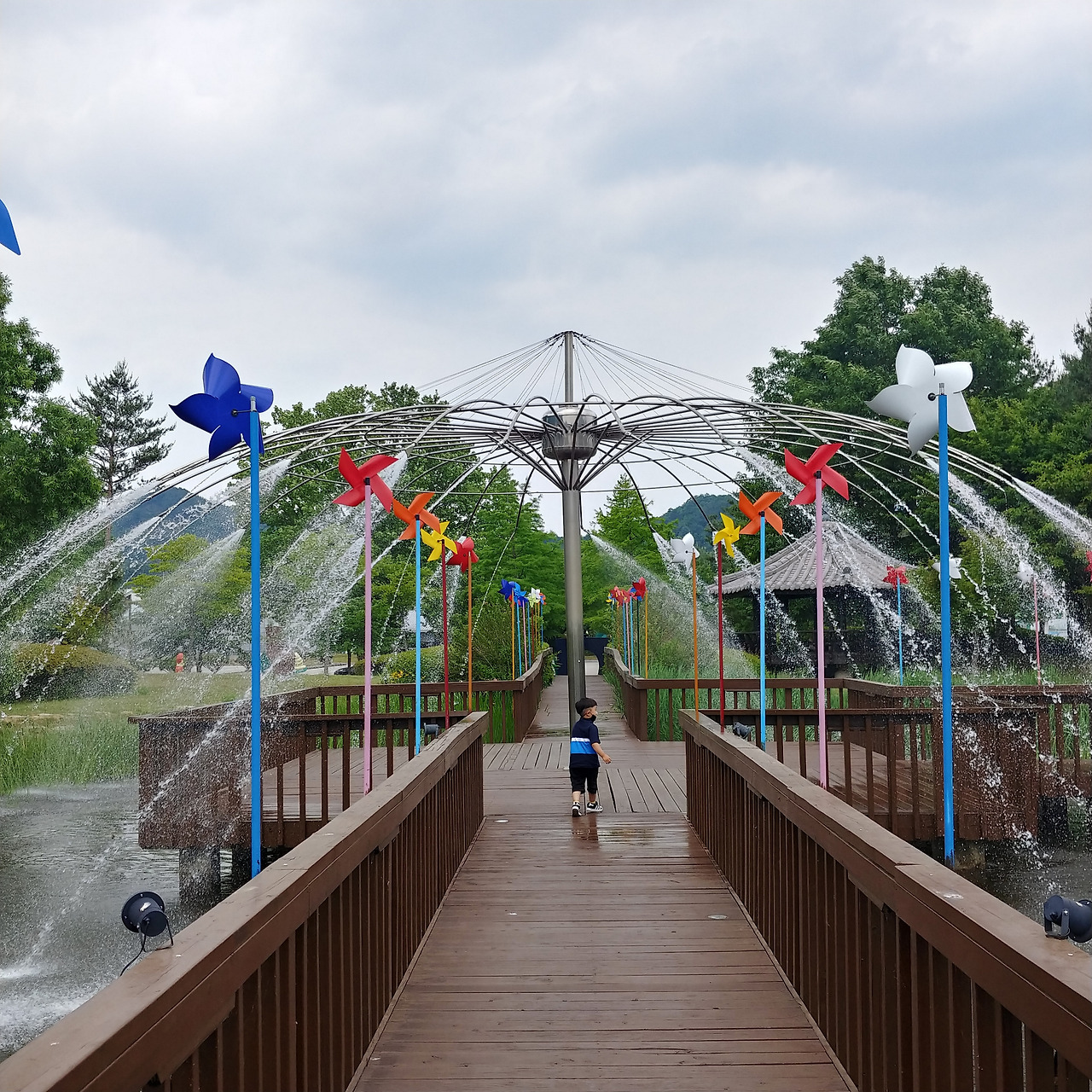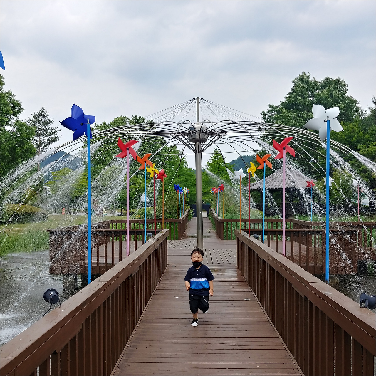 주차장 쪽 입구에 분수 시설이 있었다. 분수대에서 뿜어져 나오는 물이 시원했는지 계속해서 데크를 왔다 갔다 하면서 물 사이를 통과했다. 벌써 무더운 것을 보니 곧 계곡으로 물놀이 가야겠다.