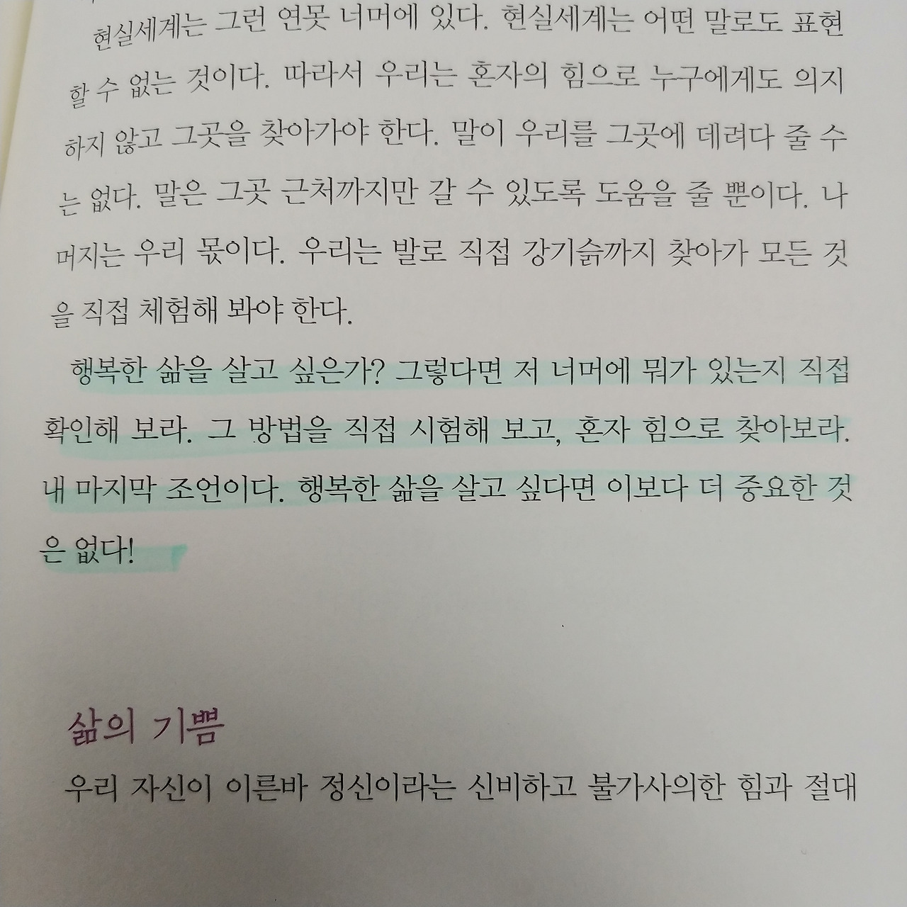 한마디 보태자면 이 책을 읽으면서 분명한 사실은 행복은 요행이나 선물이 아니었다. 운이 좋아 생기는 것도 아니고 타인이 주는 것도 아니다. 결국 행복은 외적인 요인에 의해 좌우되는 것이 아니다. "행복은 가까운 곳에 있습니다."라는 말처럼 행복의 요인은 소소한 일상과 평범한 삶에 있다. 또한 내면에 있다. 내가 어떠한 태도를 취하느냐에 따라 행복감을 느끼느냐 느끼지 못하느냐가 달렸다. 행복한 삶은 계속해서 내면을 다듬는 일 같다.