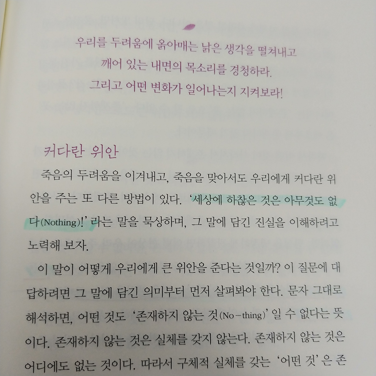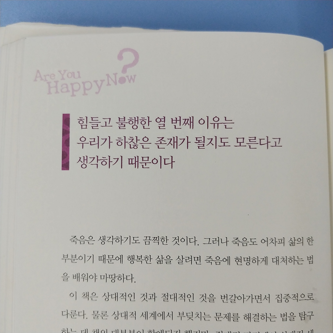 이 책 마지막 장은 죽음을 바라보는 관점에 대해 다룬다. 인간은 죽을 수밖에 없는 존재다. 그게 현실이고 현실을 직시하고 받아들여야 내게 주어진 삶을 주인처럼 살 수 있다라고 말한다. 우리가 불행하다고 생각하는 것은 죽음 앞에 나약한 자신을 마주하는데서 오기 때문이다.