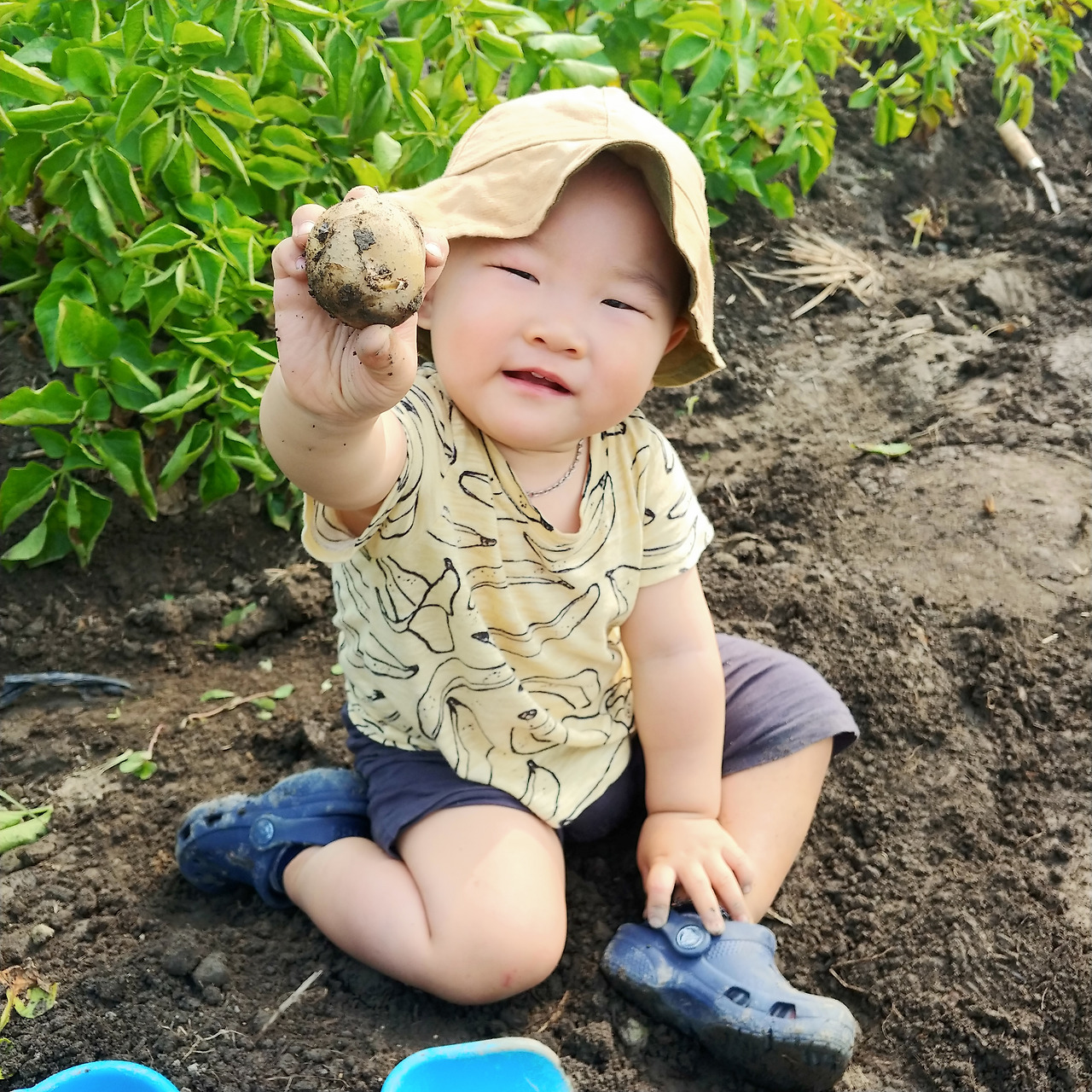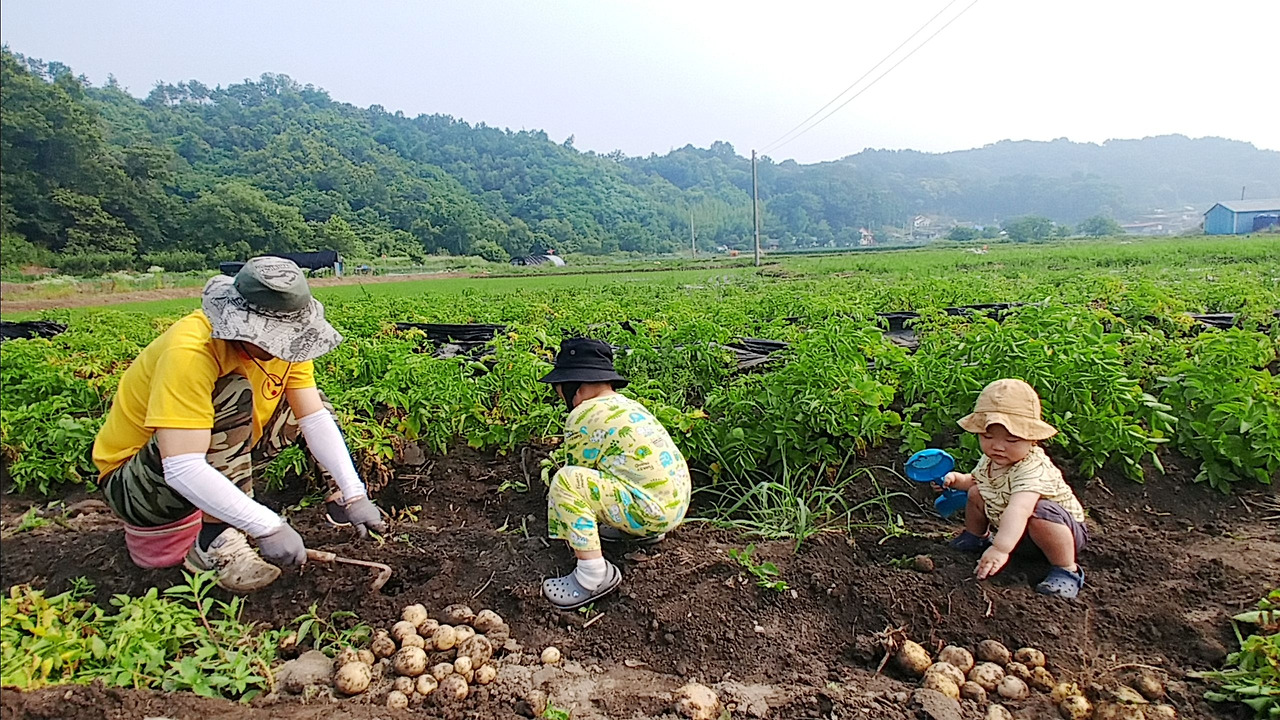 그날은 유독 더웠다. 쨍쨍 내리쬐는 땡볕에 어린 두 아들을 오래 둘 수 없어서 30분 정도 감자를 캐도록 했다. 아들은 그마저도 행복해했다. 고사리손으로 호미를 잡더니 제법 흙을 잘 팠다. 역시 중장비를 좋아하는 아들답다. 감자 줄기를 뽑아 든 아들 손에 감자알들이 주렁주렁 딸려 올라왔다. 아들은 신났는지 나를 졸졸 따라다니며 고랑에 털썩 앉아 감자를 캐기 시작했다. 아들은 감자전 해 먹을 생각에 신이 났다.