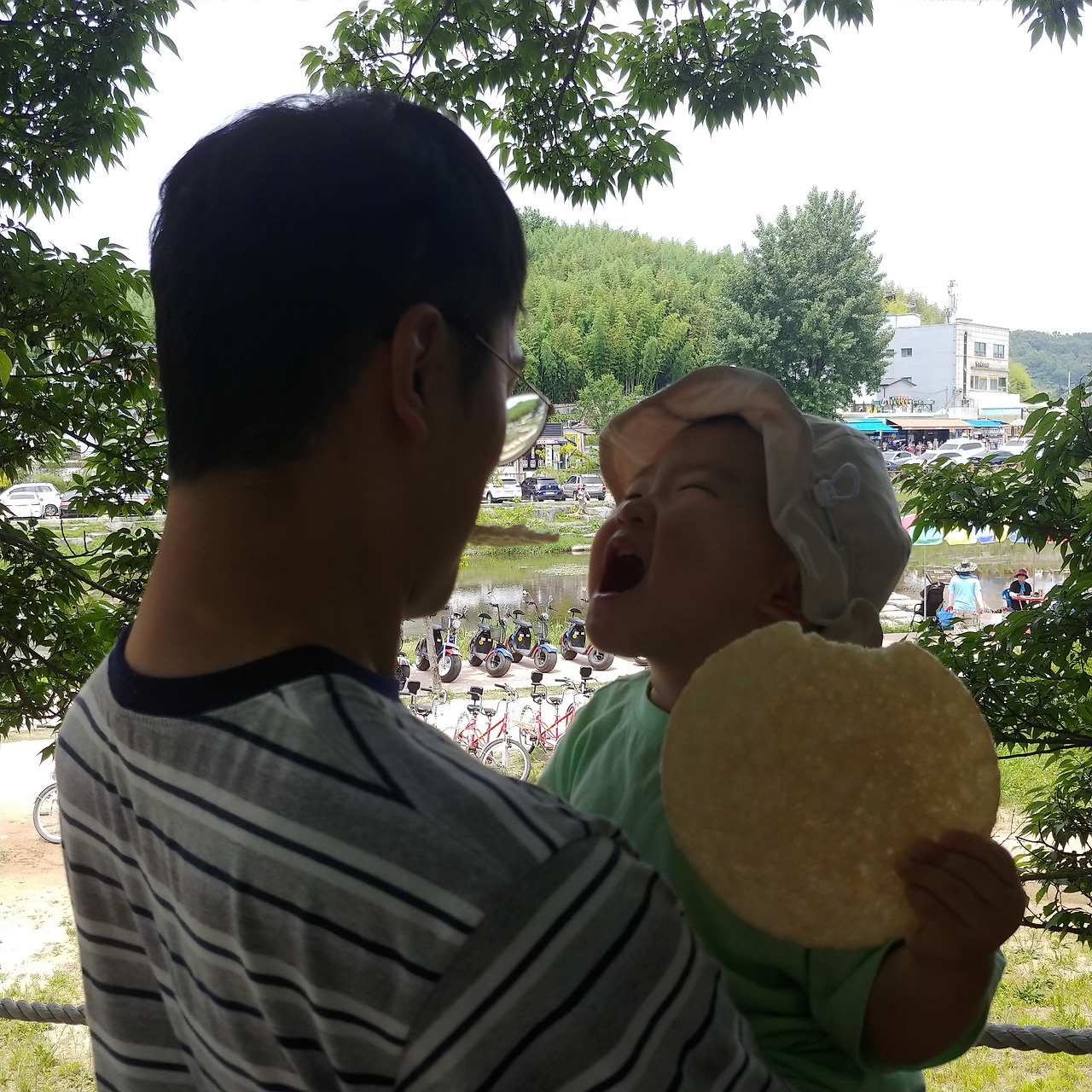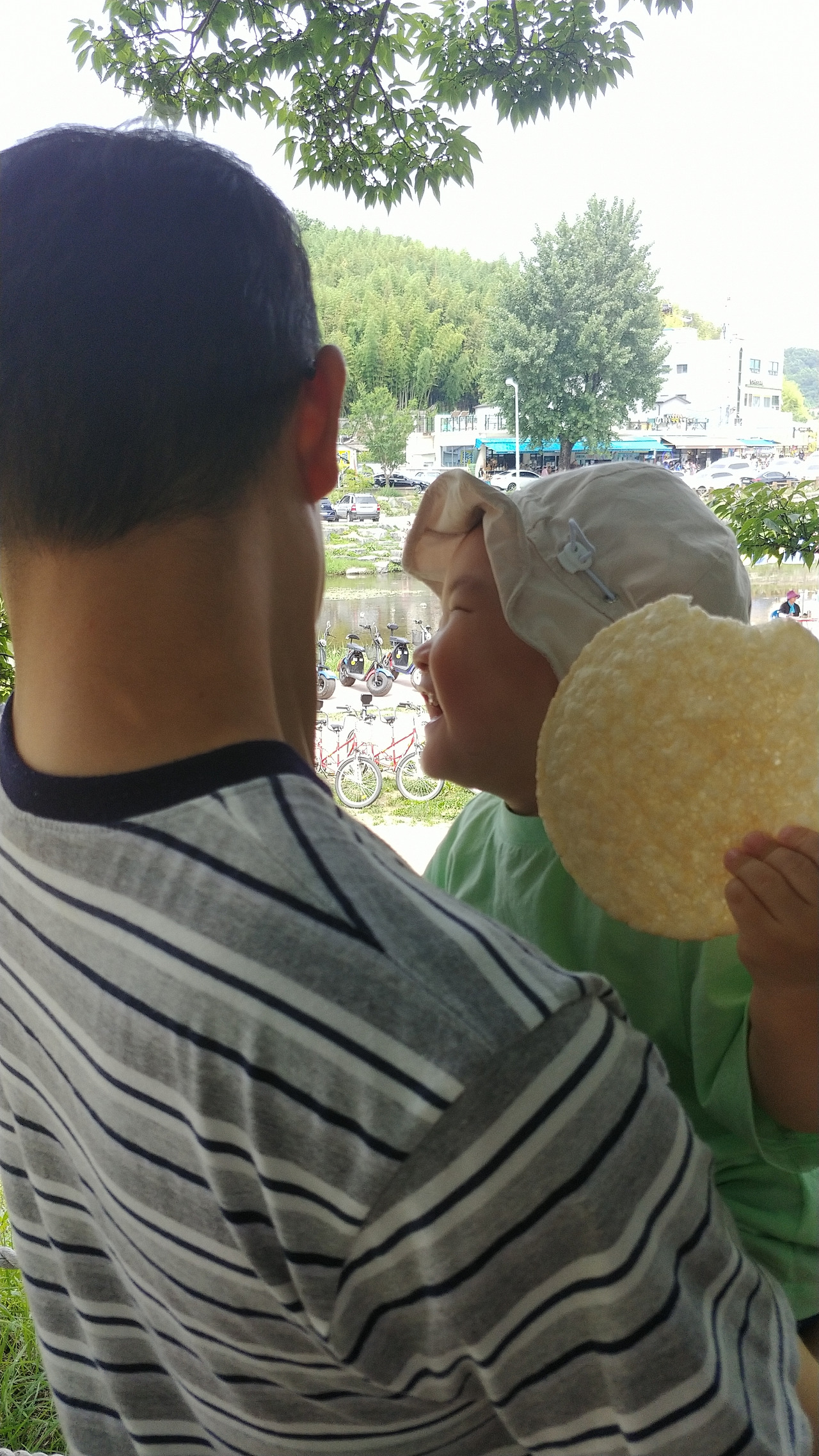 이미 나들이 나온 가족들과 데이트하는 연인들로 가득했고 큰 가로수 그늘 아래에 자리하고 있었다. 천변에는 전동 바이크나 두 명이서 페달을 밟는 커플 자전거를 타는 사람들이 많았다. 전동 바이크는 그렇다 치더라도 이 무더운 날씨에 자전거 페달을 열심히 밟는 아빠와 남자 친구만 눈에 들어왔다. 아마도 감정이입이 됐나 보다. 어쨌든 그 모습마저도 그냥 여유 있고 행복해 보였다.