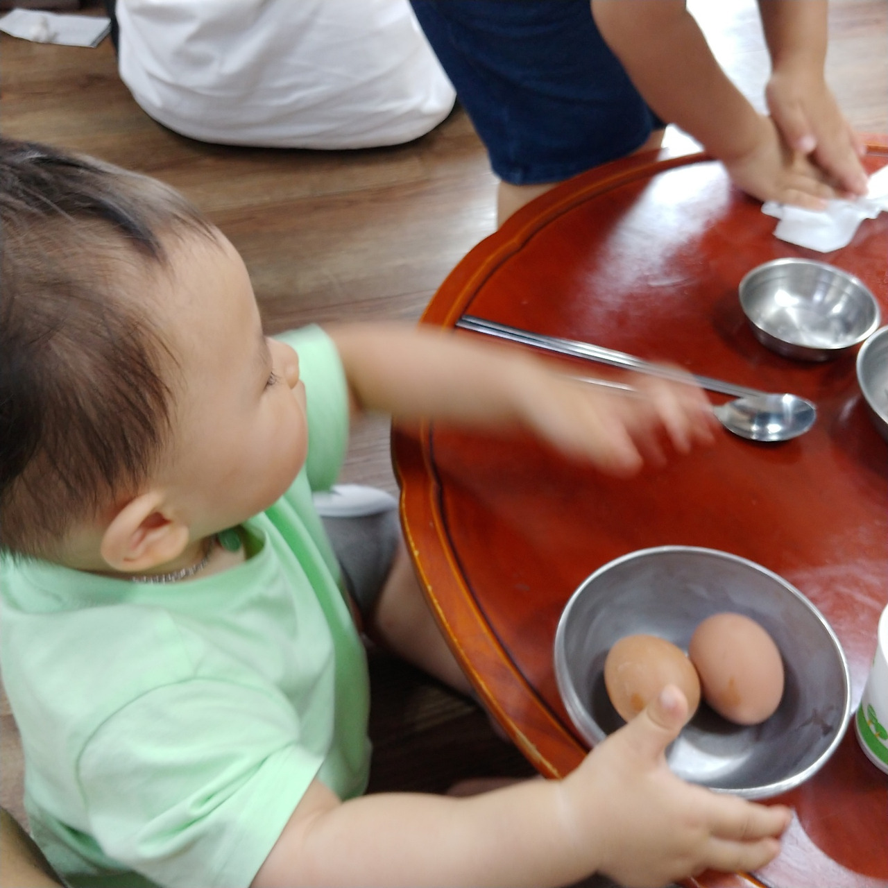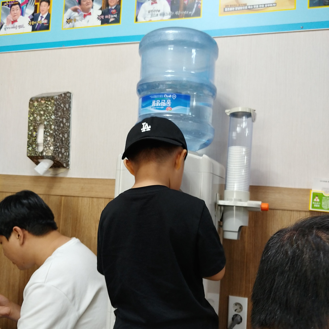 아들이 시키지도 않았는데 정수기로 가서는 물을 떠 왔다. 아들의 뒷모습이 얼마나 기특하던지 바로 찰깍. 둘째를 먹이느라 정신없었지만 좌식에서 아기의자 없이 국수를 먹는 데 성공했다.