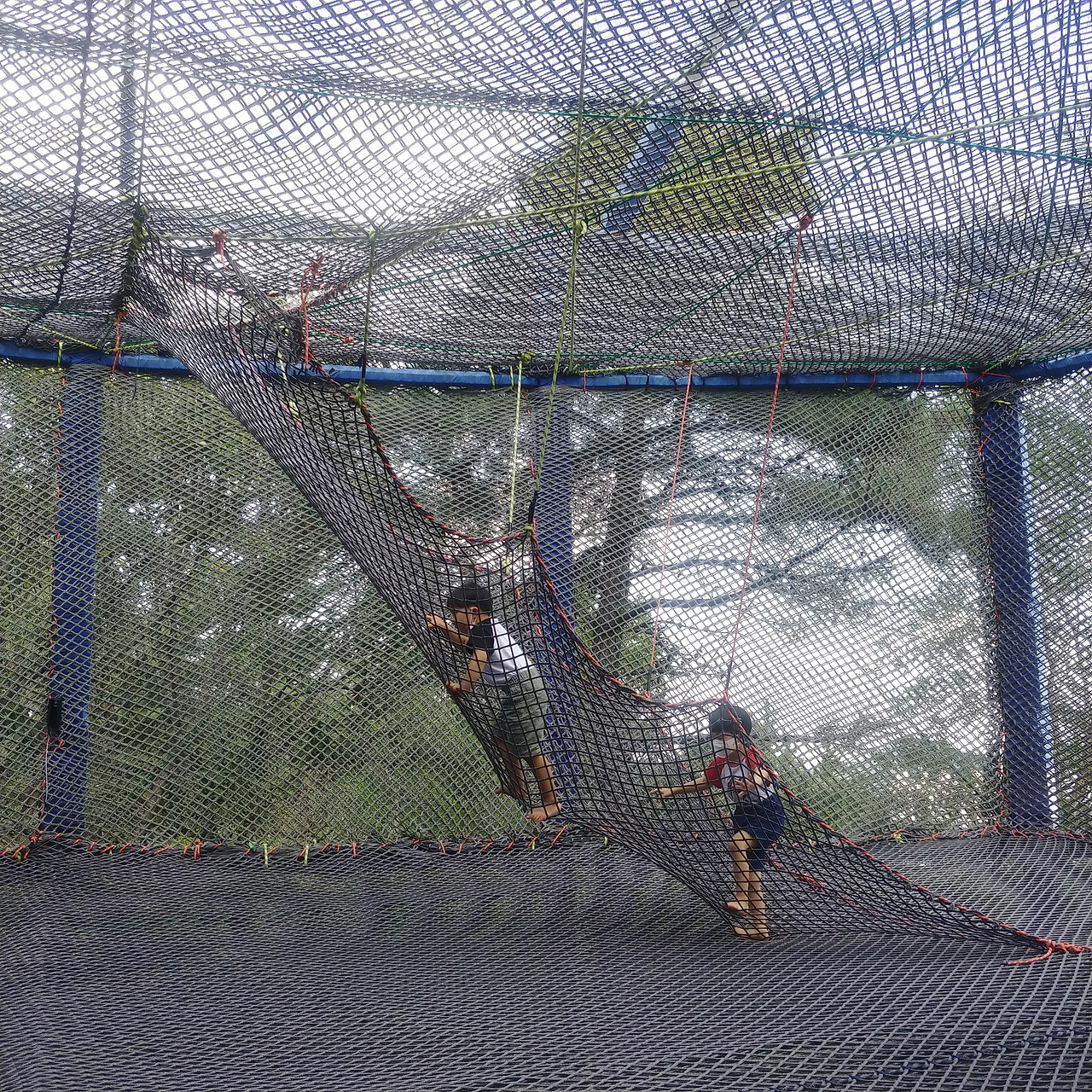 하지만 호기심이 생긴만큼 두려움도 느껴졌는지 아들은 선뜻 그물망에 오르지 못하고 망설였다. 그물망 아래로 땅바닥이 보였으니 아들이 두려울만했다. 사실 아들을 자극할 때부터 못 올라갈 거라고 생각했다. 머리 위 그물망에서 신나게 노는 아이들은 모두 아들보다 나이가 많아 보였다. 적어도 6살은 돼야 그물망에 오를 수 있을 것 같았다. 주저하는 아들에게 "유호야 무서우면 안 올라가도 돼, 유호도 6살이 되면 저기 형과 누나들처럼 오를 수 있을 거야! 그때 올라가 보자." 격려했다.