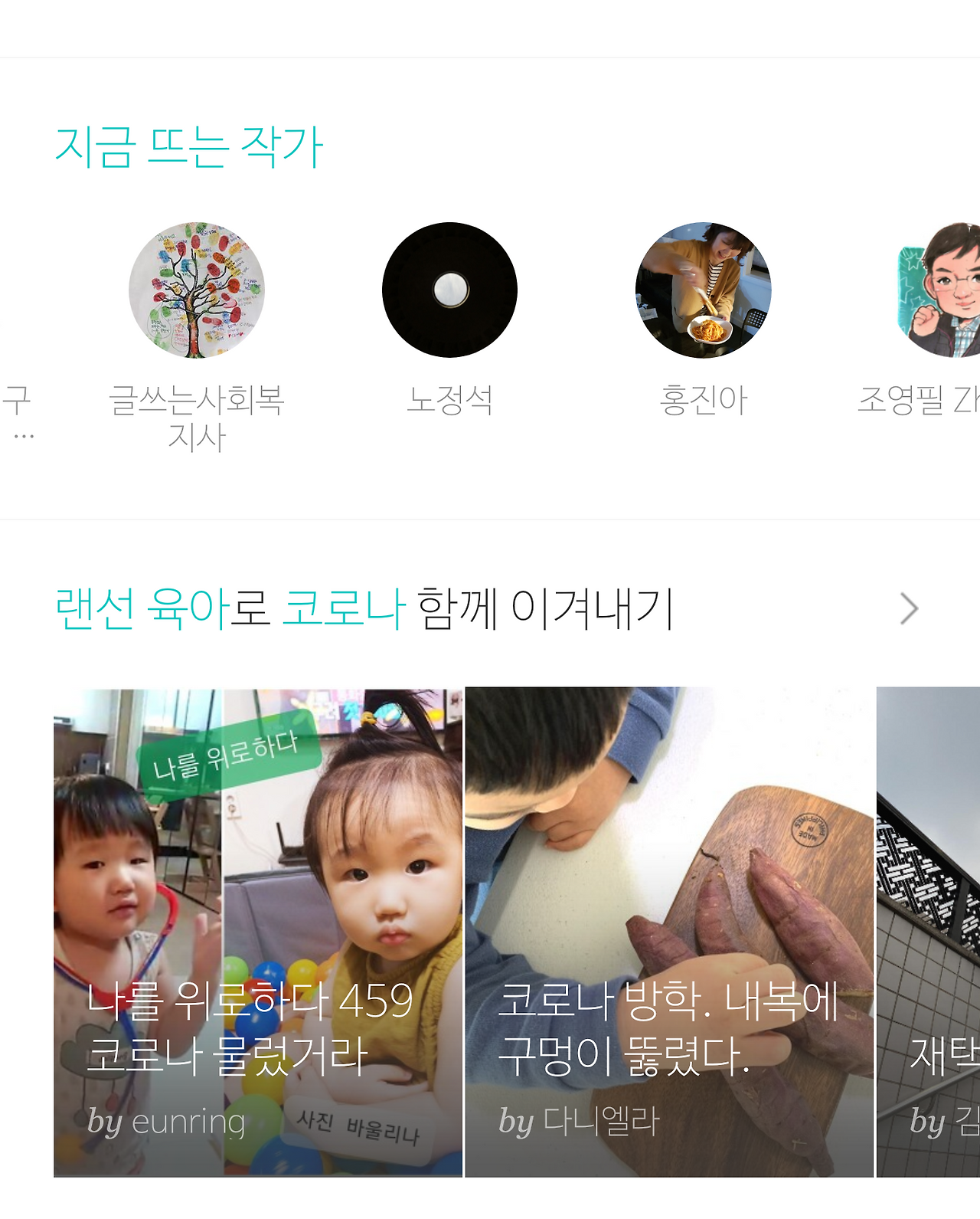 사실 그보다 다른 이유가 크다. '지금 뜨는 작가' 타이틀에 욕심이 났다. 취향 작가를 다 보고 나면 맨 마지막에 '지금 뜨는 작가'라는 제목으로 브런치 작가들이 추천되어 있다. 그중에 내가 구독하는 브런치 작가도 있어 반가울 때가 있다. 우연히라도 좋으니 내심 나의 작가명(글쓰는사회복지사)이 보고 싶었다.