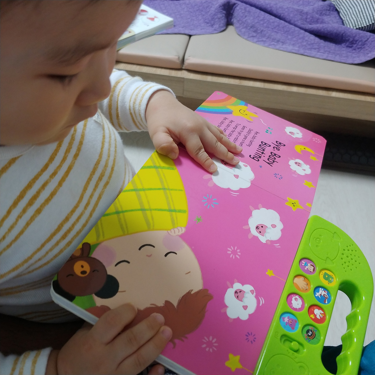 안방에서 막내에게 분유를 먹이고 있었다. 수유 의자에 앉아있었는데 둘째가 동요 책을 가지고 와서 내 다리에 기댔다.