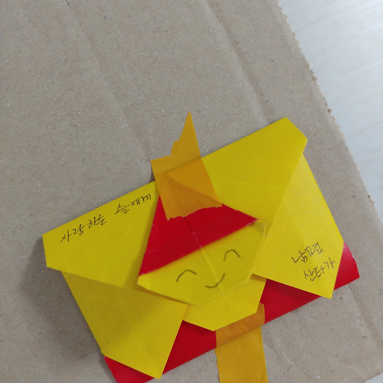 택배 박스에 투박하게 붙인 편지지 다른 색종이에 편지를 썼다. 결혼기념 2000일을 축하하는 내용이었다. 세 아이도 축복이자 선물이지만 당신만큼은 아니라고, 아이보다 당신을 먼저 챙기라는 진심을 담았다. 편지를 쓰고 편지지 모양으로 접어 [산타카드]에 넣었다.