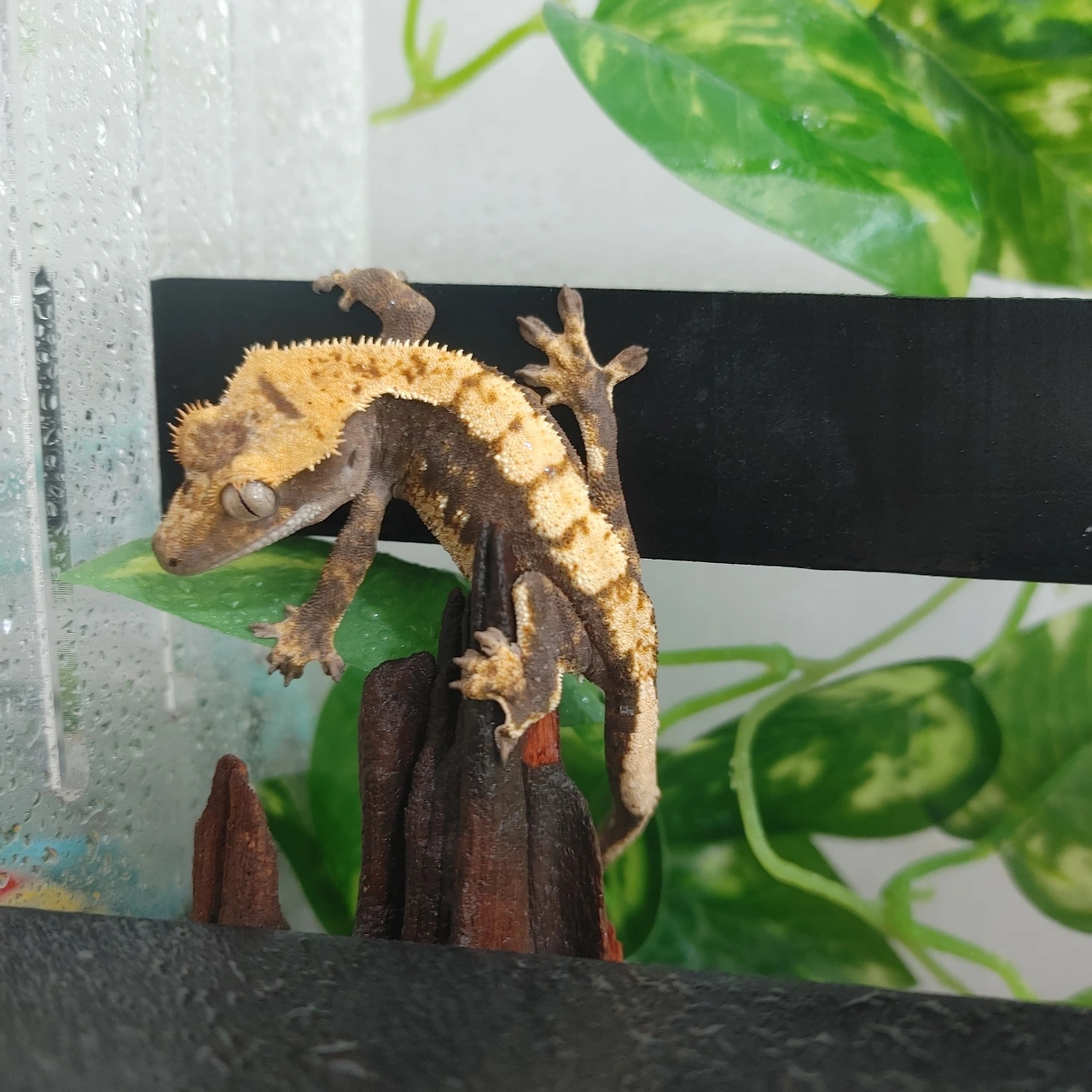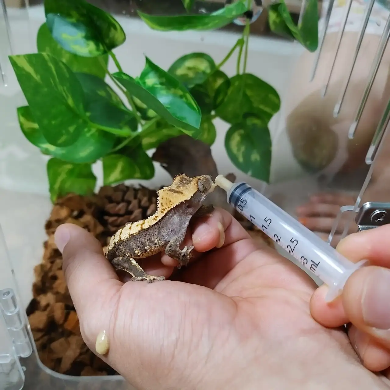 요즘 도마뱀멍이 일상이다. 아침저녁으로 사육장 안에 분무기로 물을 뿌려 습도 조절한다. 사료 먹는 덕분에 귀뚜라미를 꼭 살 필요도 없다. 이틀에 한 번 사료를 물에 풀어 주면 된다. 마스카라 칠한 듯 속눈썹이 위로 올라간듯한 눈은 정말 빠져든다. 세로 모양의 눈동자를 보면 넋 놓고 바라볼 수밖에 없다.
