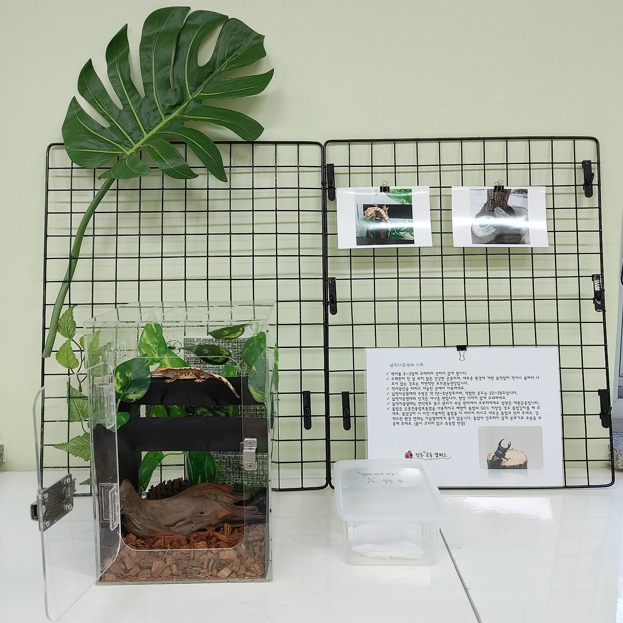 직접 장식물을 고르게 했다. 사육장을 꾸미고 복지실에 놨다. 평일은 아이들이 사료와 물을 돌아가며 준다. 주말은 아무도 없는 교육복지실에 둘 수 없어 어쩔 수 없이? 집에 데려간다. 여름 방학이라 요즘은 출퇴근길에 가지고 다닐 수 없어 그냥 집에 두었다. 가까이 두고 오래 봐서 그런지 도마뱀멍에 빠졌다.