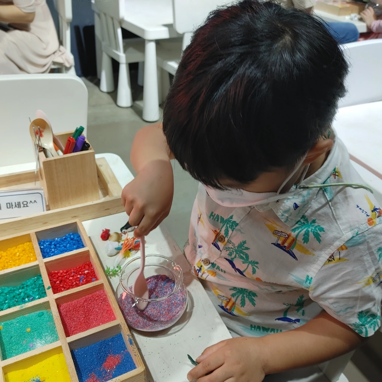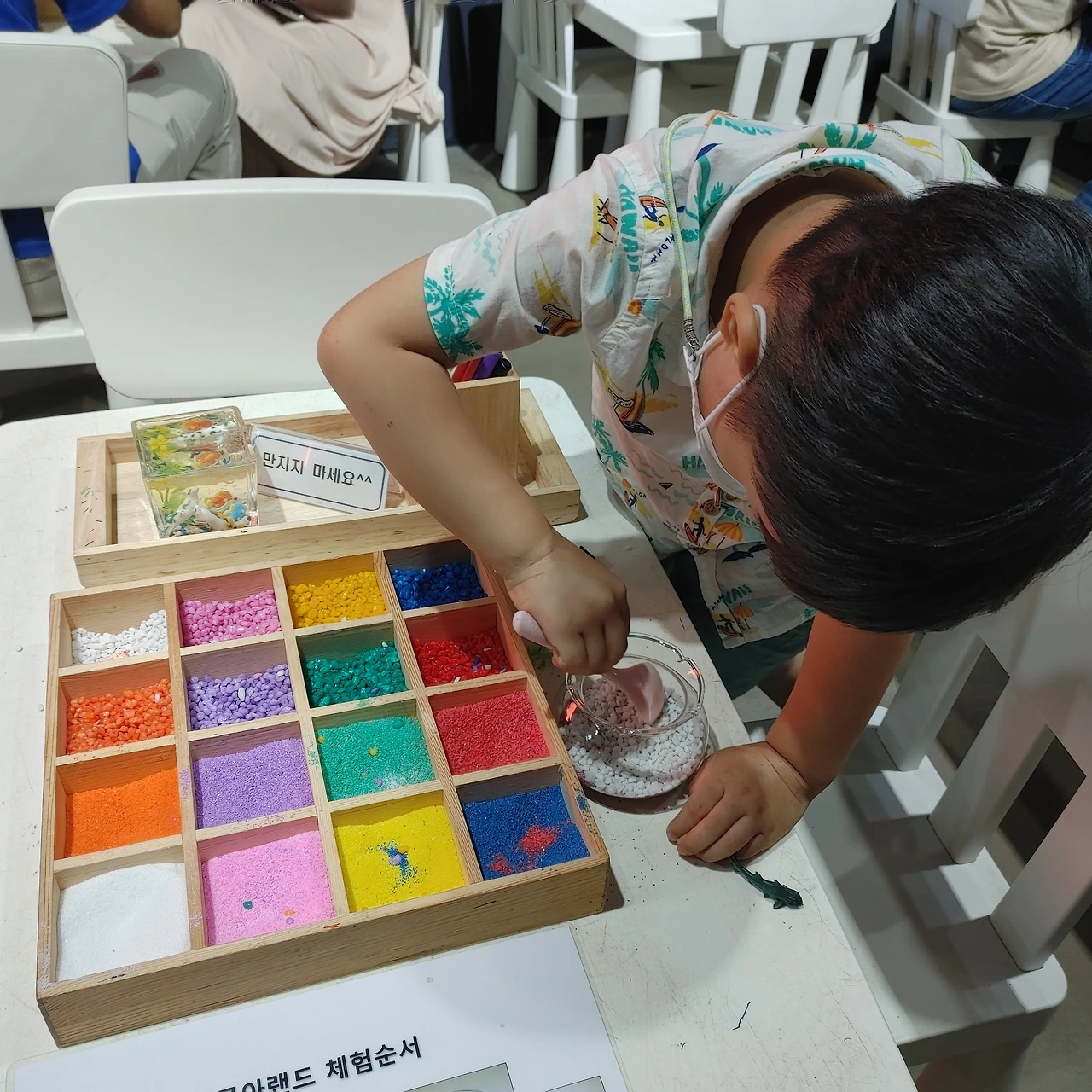 진짜 여행의 마지막 일정, 젤 캔들 만들기. 색 모래와 자갈, 다양한 피규어를 투명한 병에 담아 꾸미는 체험이었다. 관람하는 곳에서 버젓이 벌려놓은 체험이라 그냥 지나칠 수가 없었다. 아들 역시 보자마자 피규어를 만지작거렸다. '아빠 이거 하면 안 돼?' 묻는 아들에게 안된다고 거절할 수 없었다. 색 모래와 자갈을 깔고 직접 고른 피규어를 투명한 병에 배치했다. 만드는 내내 집중하는 아들이 신기했다. 돌에 이름을 세기고 젤이 굳기를 20분 기다렸다. 완성된 것을 보고 어찌나 좋아하던지 하길 잘했다 생각했다. 진짜로 여수여 안녕.