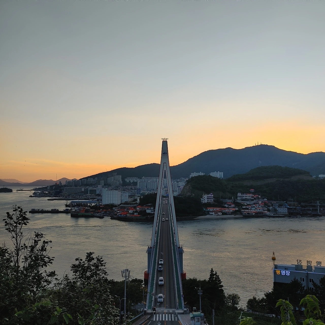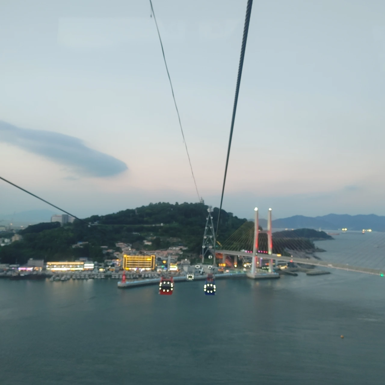 뉘엿뉘엿 해가 저물고 돌산대교가 물들었다. 캄캄해지고 돌산 대교에 불이 켜질 때까지 기다리려고 했는데... 졸렸는지 숙소로 가자고 재촉하는 아들에 하는 수 없이 발길을 돌릴 수밖에 없었다. 아들에게 돌산 대교 야경을 보여주고 싶었는데 아쉬웠다. 한 번 타봤다고 숙소로 돌아가는 케이블카에서는 여유로웠다. 그래도 손발에 식은땀이 삐질삐질 나긴 하더라. 그렇게 여수 밤바다를 보지 못하고 여행의 첫날이 저물었다.