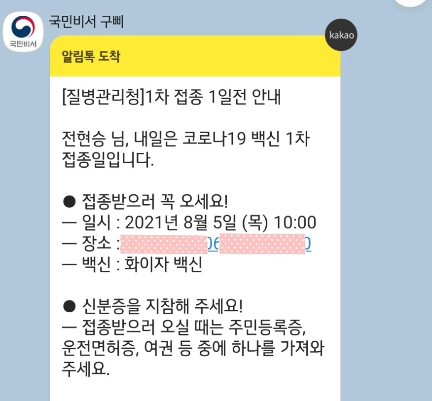 부르르 국민비서 구삐에게서 카톡이 울렸다. 피할 수 있으면 피하고 싶었던 백신 접종. 학교에서 근무하기 때문에 피할 수 없다. 드디어 내일이 코로나 백신 접종하는 날이다.
