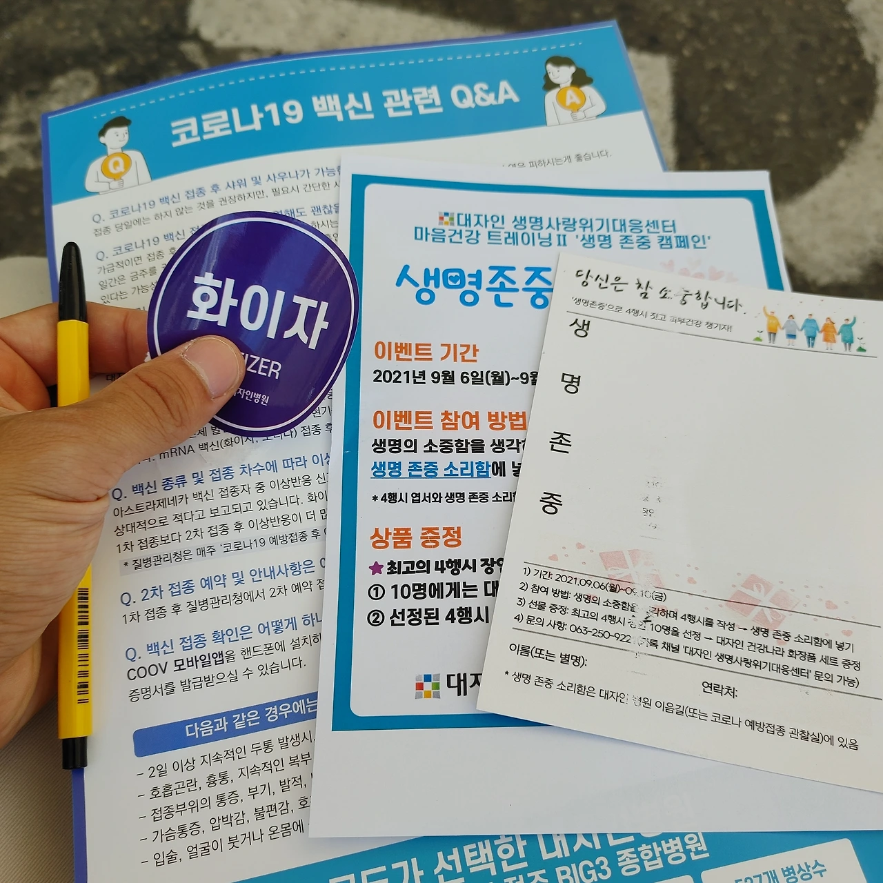 병원에서 이상 반응을 보기 위해 15분 대기하고 가라고 안내했다. 간호사의 안내에 따라 흰 천막 안에 들어가 앉았다. 15분 기다리기 지루하지 말라고 병원에서 이벤트를 준비한 모양이다. '생명존중' 4행시 써서 선정이 되면 선물을 준단다. 또 이런 것은 눈을 부라리며 열심히 한다. 머리를 쥐어짜며 몇 자 적어냈다.