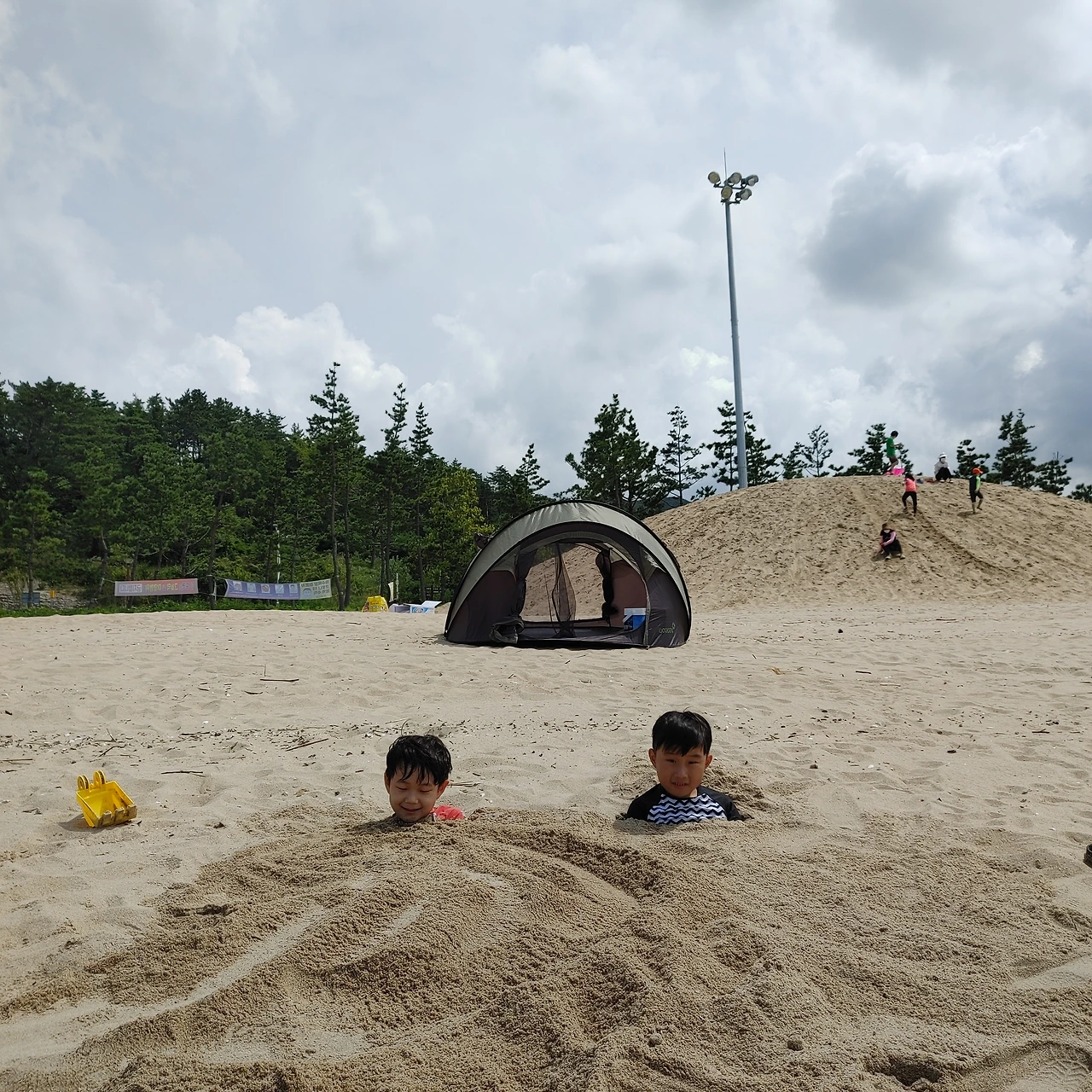 평소 같았으면 주말 나들이 나온 사람들로 붐볐을 텐데 이상스러울 만 큰 한산하고 조용했다. 그 덕에 처음으로 해변과 가장 가까운 주차장에 주차를 했다. 차에 내려 양손에 짐을 바리바리 들고 아이들과 함께 해변으로 갔다. 아니나 다를까 해수욕장에 사람이 별로 없었다. 모래 언덕 가까운 곳에 텐트를 치고 자리를 잡았다.
