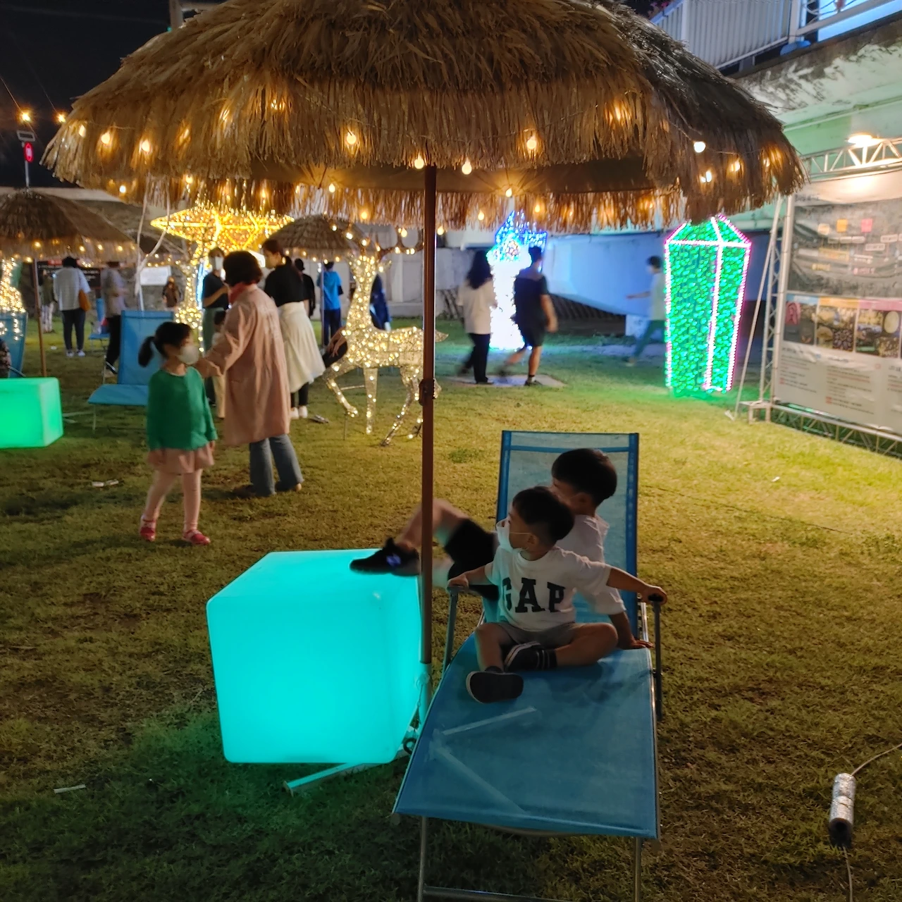 달하다리에서 내려다보이는 LED 꽃잔디 물결이 이뻤다. 형형색색 화려한 조명과 다양한 조명 포토존이 많아 사진 찍기 좋았다. 아이들도 좋아했다. 셋째가 빛나는 조명을 보고 품 안에서 까르르 웃었다. 사실 제일 신났다. 첫째는 하루 종일 걸어서 피곤했는지 얼마 지나지 않아 집에 가자고 칭얼거렸다. 둘째는 여전히 쌩쌩. 살짝 불안했다.