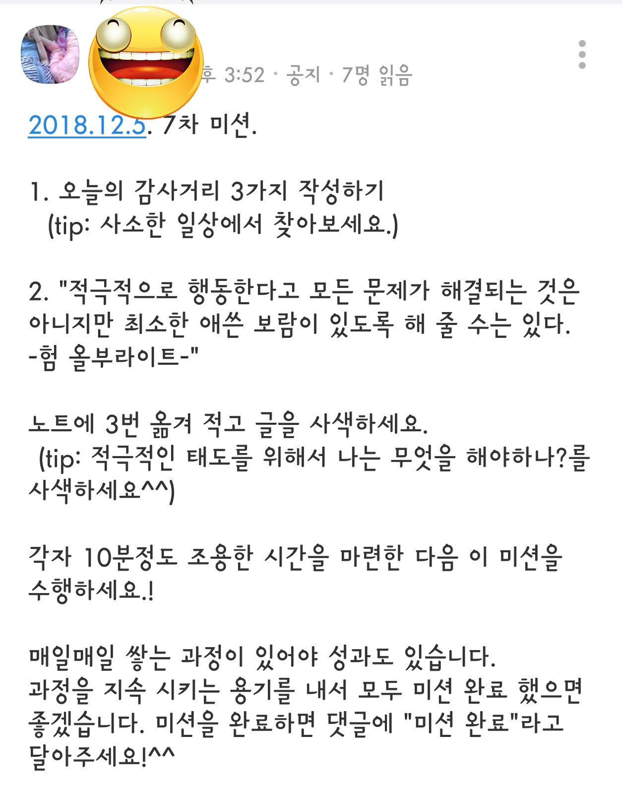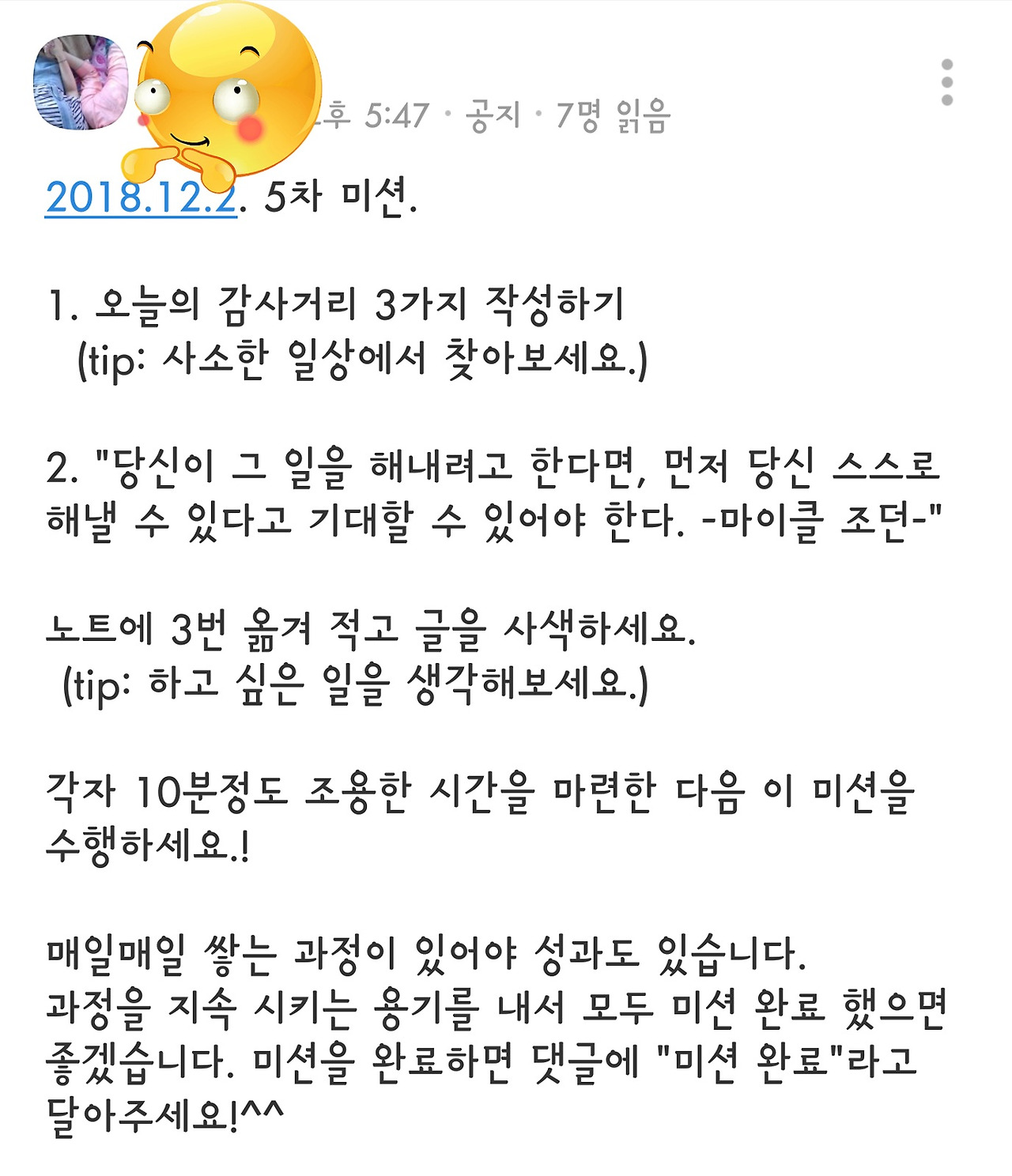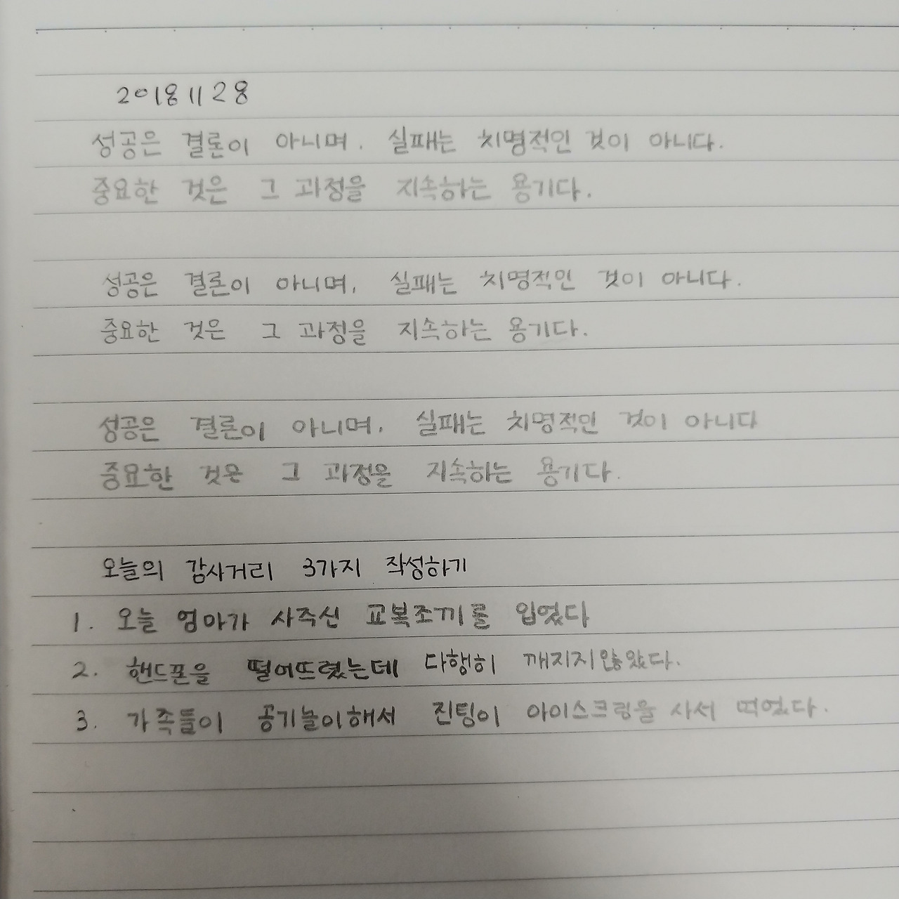지금 10명의 학생들과 함께 감사일기를 쓰고 있다. 매일매일 긍정적인 한 줄(명언) 쓰기와 하루 동안 일어난 일들 중에 감사거리 3가지를 찾아 쓰도록 했다. 현재 글쓰기를 한 지 20일이 되었고 목표한 30일에 가까워진다. 매일매일 글쓰기의 효과를 이야기 하기 턱 없이 부족한 시간이다. 그래도 학생들의 이야기가 궁금하다. 30일을 채우면 학생들과 그동안의 글쓰기 과정에서 느낀 점과 배운 점, 변화된 점에 대해 나눌 예정이다.