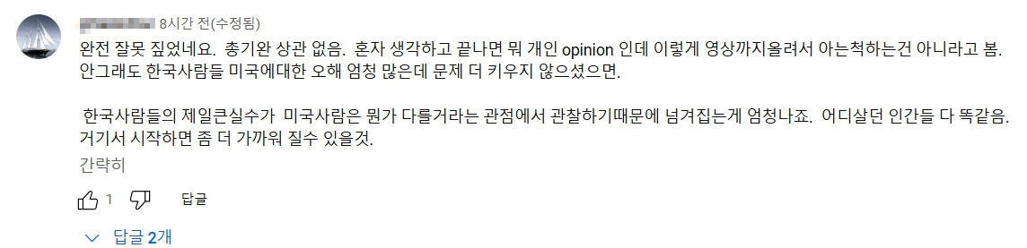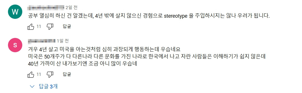 "개인 의견을 영상으로 올려서 아는 척하는 것은 아니라고 생각한다" 등 감사하게도 정말 많은 의견들을 주셨다. 아니면 놀랍게도 외모 비하를 하면서 "늙은 동양인 여성이라서 그런 거 아니냐?"라는 조롱까지 들어야 했다.
