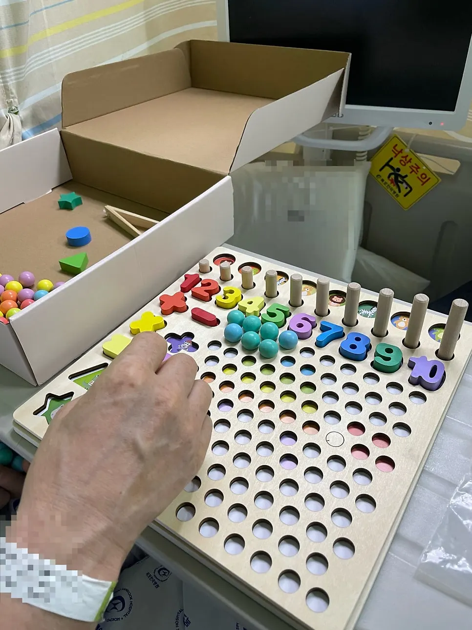 - 아이용 교구를 사서 왼손으로 구슬집기 및 퍼즐 맞추 기 훈련