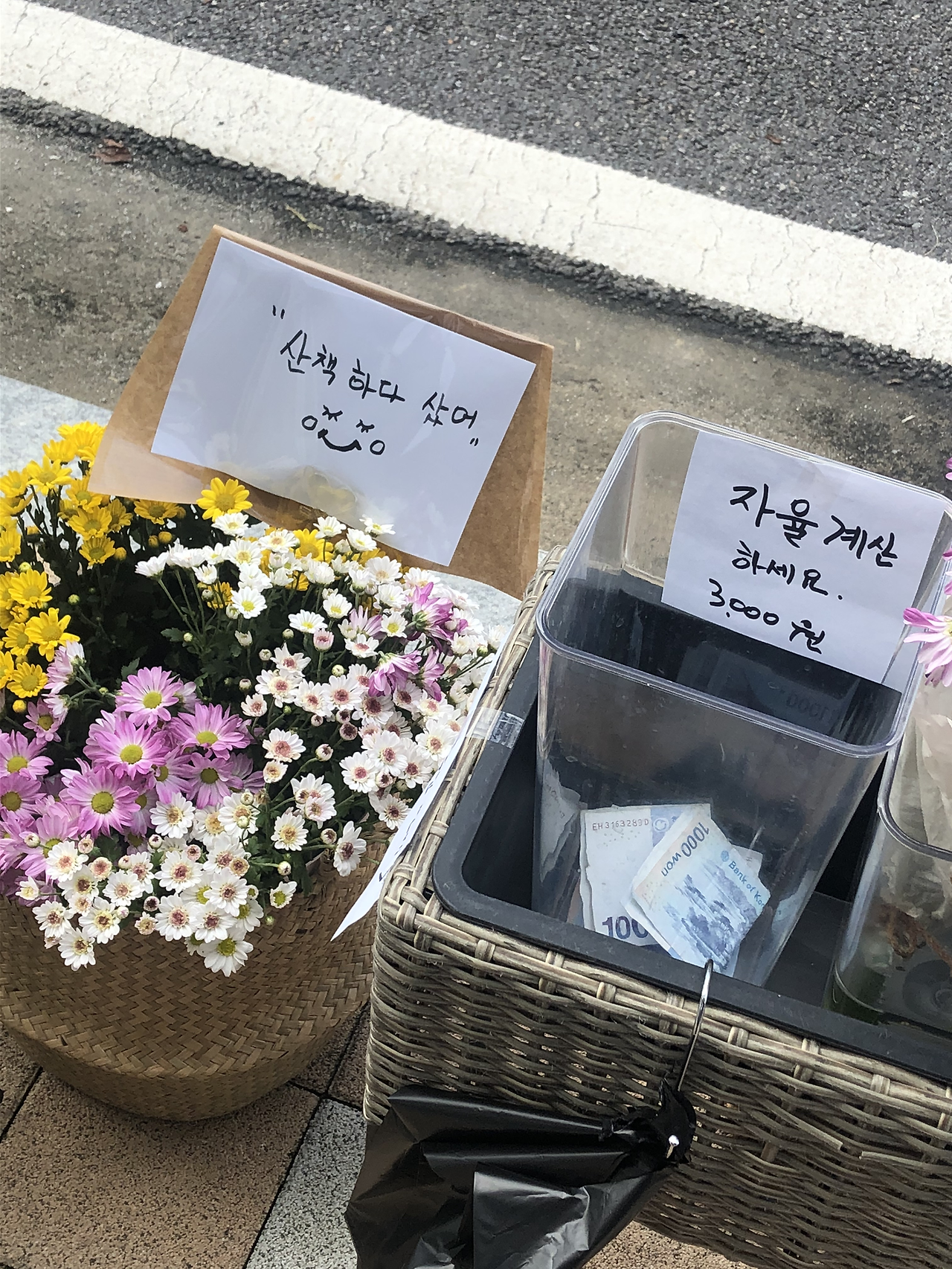 어제치 낭만. 산책하다가 꽃을 샀다. 요즘 보기 드문 현금통에 현금을 넣고 가져가면 되는 무인 결제 방식을 사용하는 가게였다. 마침 수중에 삼천 원이 있어서 삼천 원을 통에 넣고 한 다발을 집으로 데려와 화병에 꽂았다.