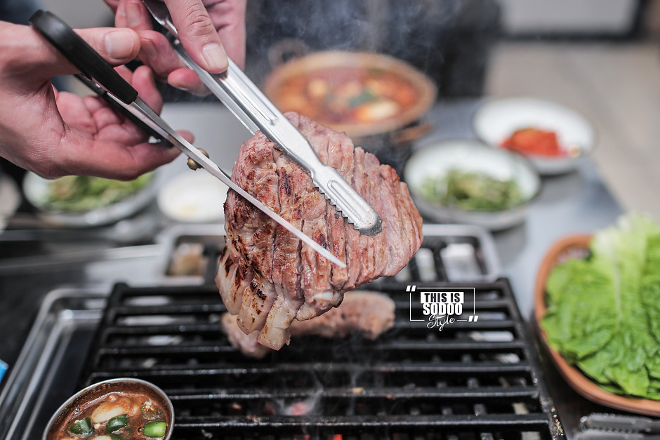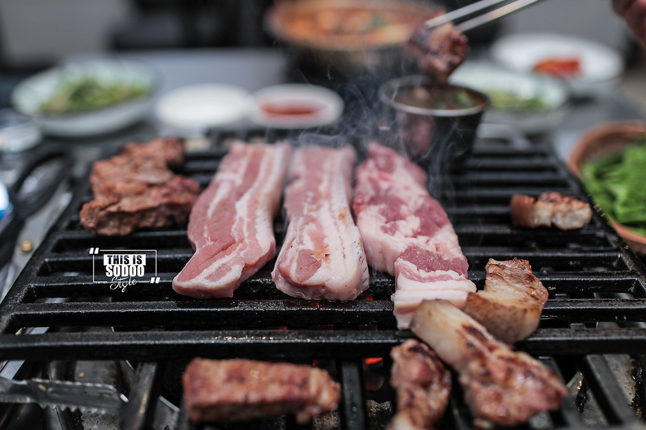 가게이름이 무쇠1982이라는 것처럼 불판도 무쇠로 되어있었다. 고기가 눌러붙지 않도록 비계로 골고루 불판을 닦아주면서 먹방의 서방을 알리기 시작한다.