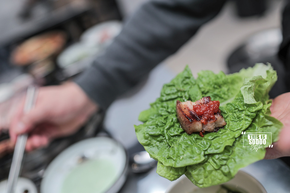 왼손엔 쌈을 올리고 오른손에는 소주잔을 준비하는 자세가 필요하다.