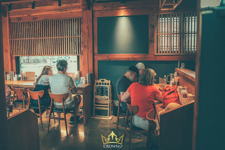 20분쯤 기다렸을까 자리가 나와서 안으로 들어갈수있었다. 일반적인 사각형 테이블은 없고 다찌 형식의 테이블만 존재했다. 혼밥을 하는 사람들도 부담없이 방문할수있게 하기위한 전략이었을까? 아무튼 분위기는 상당히 고풍스럽고 요즘 트렌드와 잘 접목된 모습이었다.