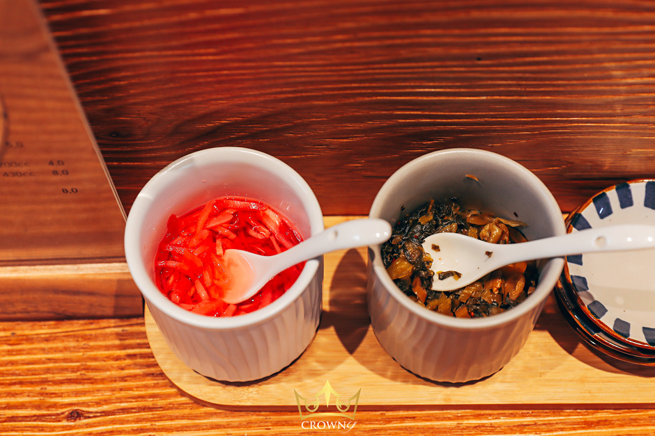 라면을 먹을때는 김치가 필수지만 라멘을 먹을때는 그 문화에 걸맞게 초생강과 타카나즈케(갓절임)가 테이블에 같이 셋팅이 되어있다. 기호에 따라 라멘에 넣어먹기도 하고 김치처럼 곁들여 먹을수도 있다.