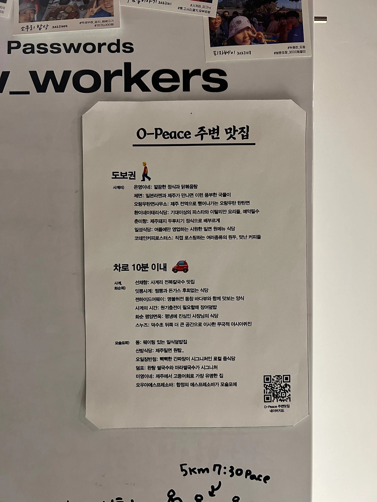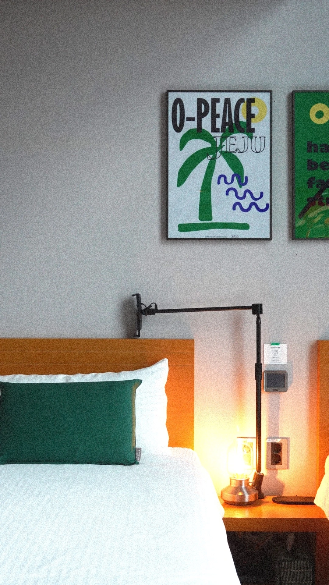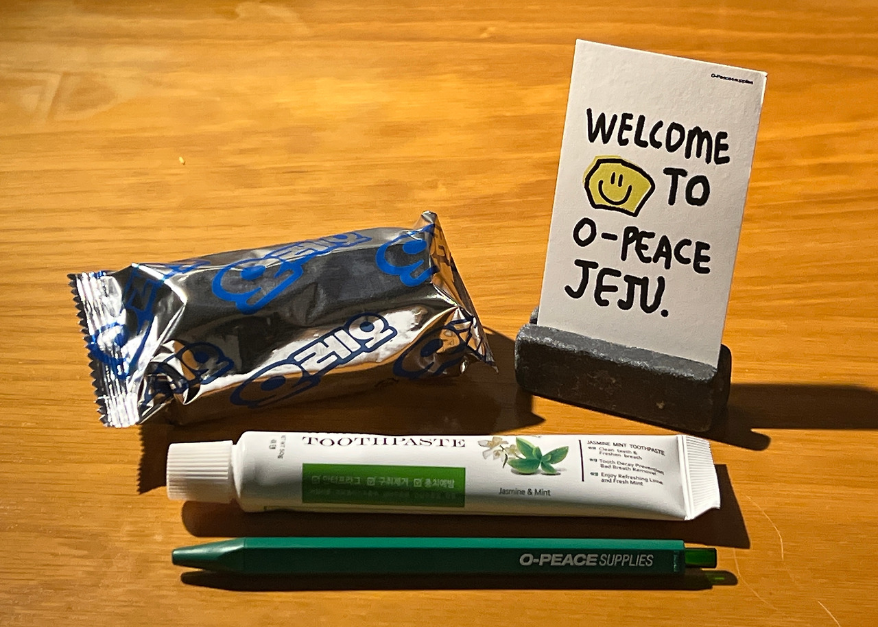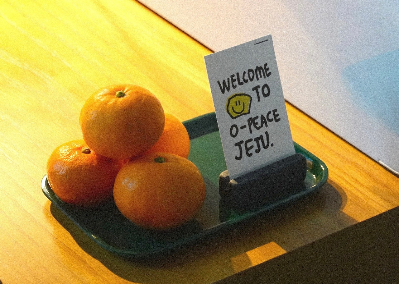 도어락의 비밀번호를 입력하고 문을 열자 방 안에서 Lo-fi 재즈가 흘러나왔다. 입실 시간에 맞추어 미리 재생해둔 워케이션 플레이리스트. 단순한 제스쳐 하나에 똑같은 방이 그저 예약한 객실에서 '나를 위해 준비된 공간'으로 한 순간에 바뀌었다. 책상 위에는 귤 네 개가 놓여 있었다. 겨울철 제주에 오면 식당이며 카페에서 몇 개씩 쥐여주는 흔하디 흔한 귤이지만 이 네 알은 특별했다. "WELCOME TO O-PEACE JEJU"라는 짧지만 강력한 환영의 메시지 때문에. 이건 누가 뭐래도 타고난 센스의 영역이다.