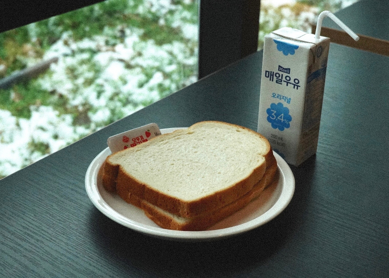 → 캔틴에 식빵과 토스터, 잼과 피넛버터가 준비되어 있다. 커피 무료 제공, 우유 구매 가능.