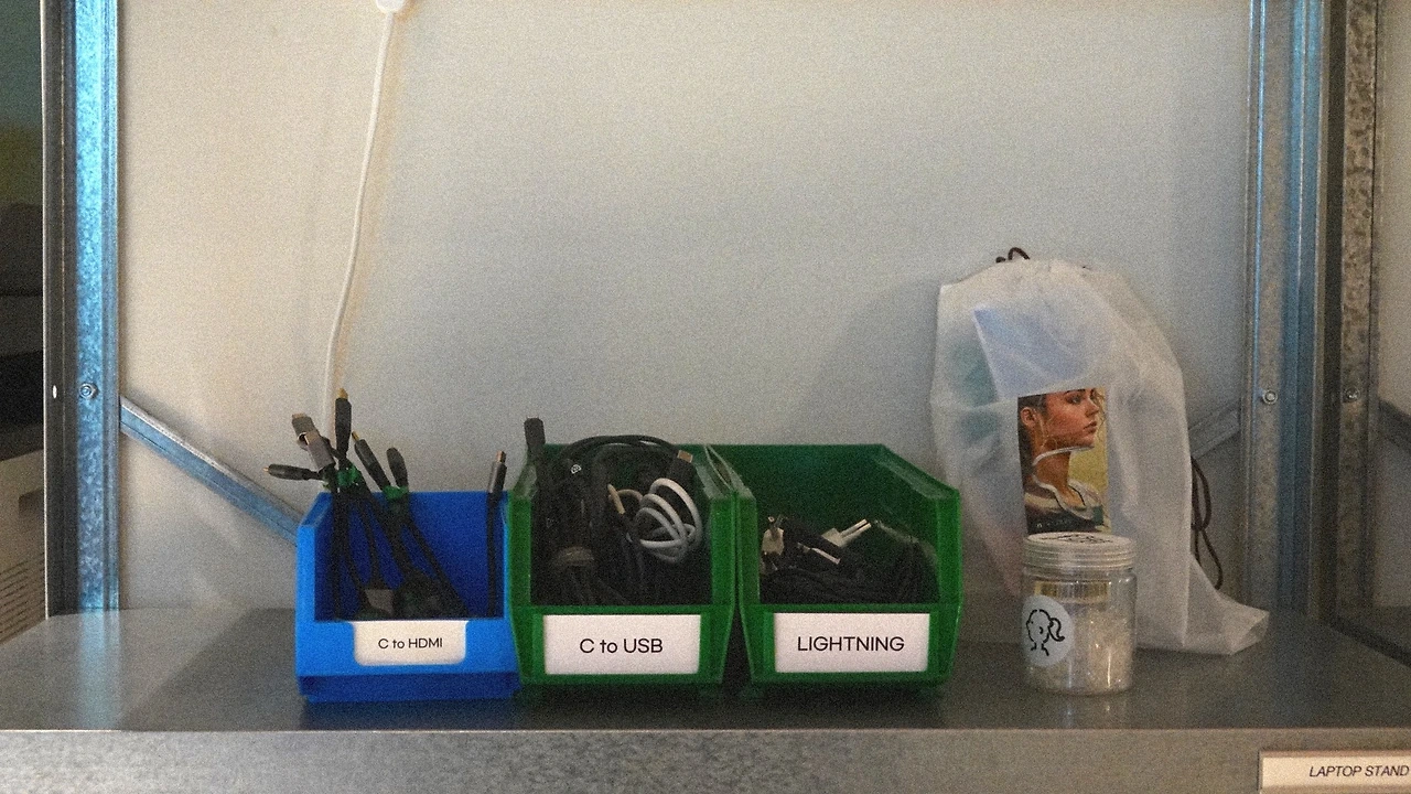 방에서 노트북과 다이어리를 챙겨나와 공유 오피스에 자리를 잡았다. 듀얼 모니터가 셋팅된 자리에 앉았는데, hdmi to c 어댑터를 두고 온 것이 생각났다. 모니터는 못 쓰겠는데, 자리를 옮겨야하나? 싶었을 때 그 선반을 발견했다. "WORKING TOOLS RENTAL CORNER". 각종 어댑터와 충전 케이블, 모니터 받침대에 키보드와 마우스까지. 있으면 좀 더 편할텐데 싶은 건 그냥 다 있었다. 노트북 주변기기들 사이에 머리끈이 든 통을 발견했을 땐 나도 모르게 탄식이 흘러나왔다. 이 사람들, 정말 무서울 정도로 진심이었다.