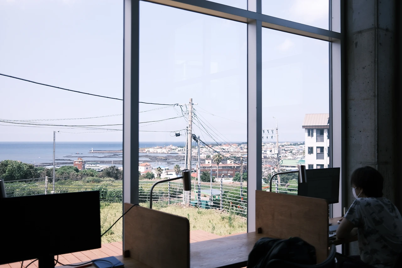오피스 제주는 노마드 워커의, 노마드 워커에 의한, 노마드 워커를 위한 공간이다. 도시에서 번아웃을 겪은 노마드 워커가 제주로 와서 만든 일할 공간. ‘책상 한자리 빌려주는 공유 오피스가 아니라, 침해 당하지 않는 평화로움과 몰입의 시간을 선물하는 곳’을 추구한다. 첫 번째 공간인 조천점은 제주도의 북쪽에 위치한 제주시 조천읍에 생겼다. 22개의 데스크와 1개의 회의실, 2개의 방음부스가 있는 공유 오피스와 조천읍의 마을 숙소를 연계해 조성한 워케이션 타운은 2019년 당시 제주에서 처음 있는 시도였다고.