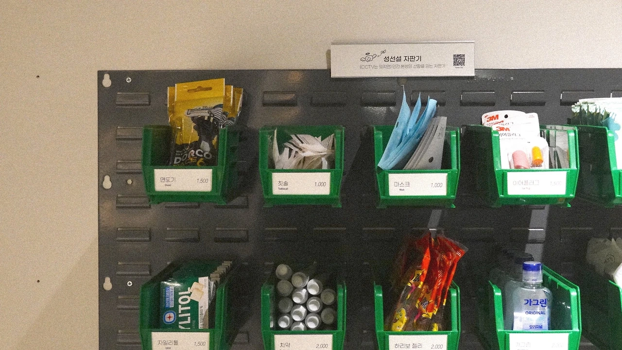 입구 앞에는 키오스크로 셀프 결제하는 무인 매대가 있다. '성선설 자판기'라는 위트 있는 이름을 달고, 칫솔, 치약, 면도기, 마스크, 귀마개, 물티슈에 휴지까지 필요하지만 빠뜨리기 쉬운 필수품을 다양하게 구비하고 있었다. 마침 여행용 칫솔 세트의 치약이 떨어졌던 터라 바로 하나를 구매했다. 눈보라를 뚫고 편의점까지 사러 다녀오지 않아도 되어서 얼마나 안심했던지. 이용자의 시간과 체력을 아껴주는 소소한 배려 뒤에는 재고 관리와 사입의 불편을 감수하고 고객 편의를 제공하고자 하는 운영자의 사려 깊음이 있었다.