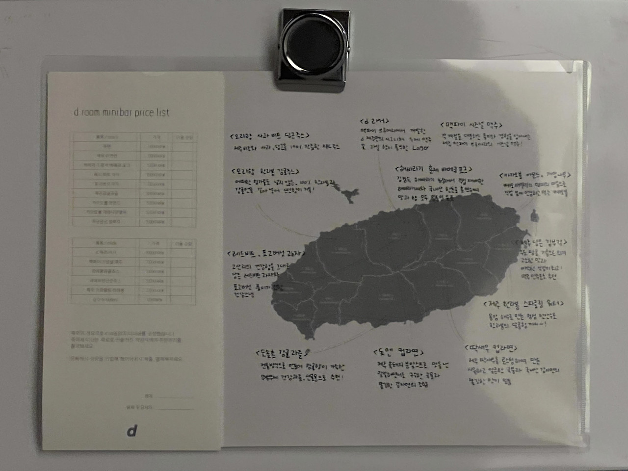 객실 : 일문판이라 읽을 수 없던 d travel 매거진에 붙어있던 한글 번역 페이지 / 제주의 다양한 먹을거리와 d 라거가 구비된 스낵바 / 스낵바에 비치되어 있는 상품의 생산지와 정보를 표시해 둔 제주 지도 / 프릳츠 커피, 이솝 샴푸와 클렌저 등 d 스토어 추천 브랜드로 구성한 어메니티