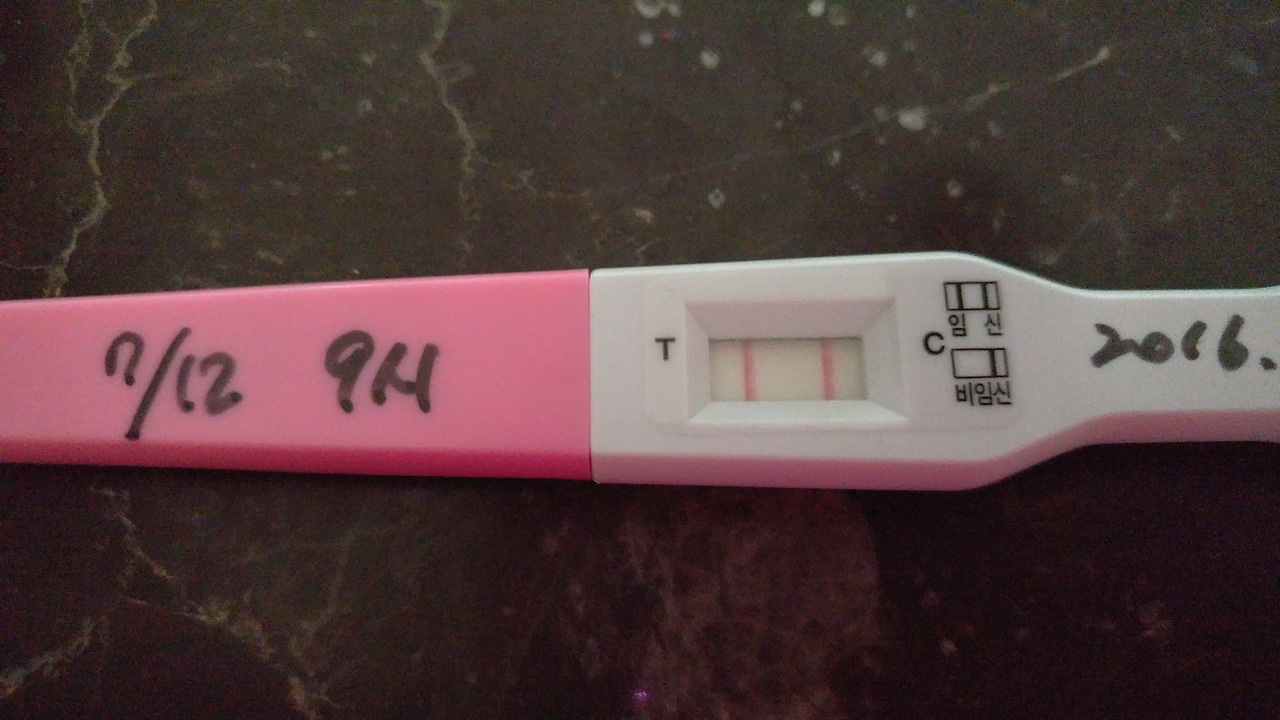 집에 와서 임테기를 갖고 바로 화장실에 가서 소변검사를 했다. 그런데 세상에나. 바로 진하게 뜨는 선명한 두줄.