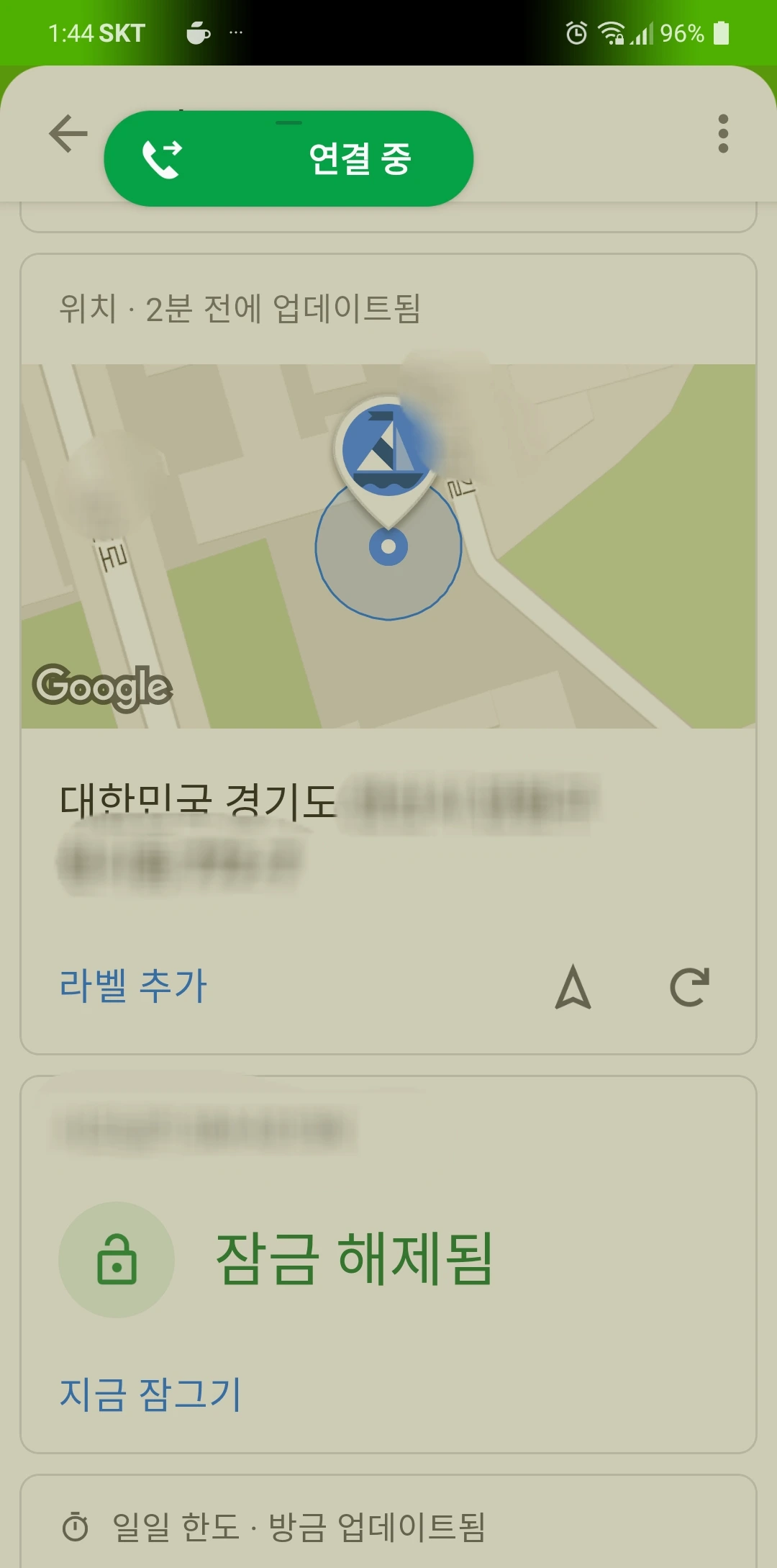 딸이랑도 선생님과도 연결은 안 되고 딸의 위치는 다른 동네에 있다는 상황의 사진. 혹시 몰라 주소를 찍어두었다.
